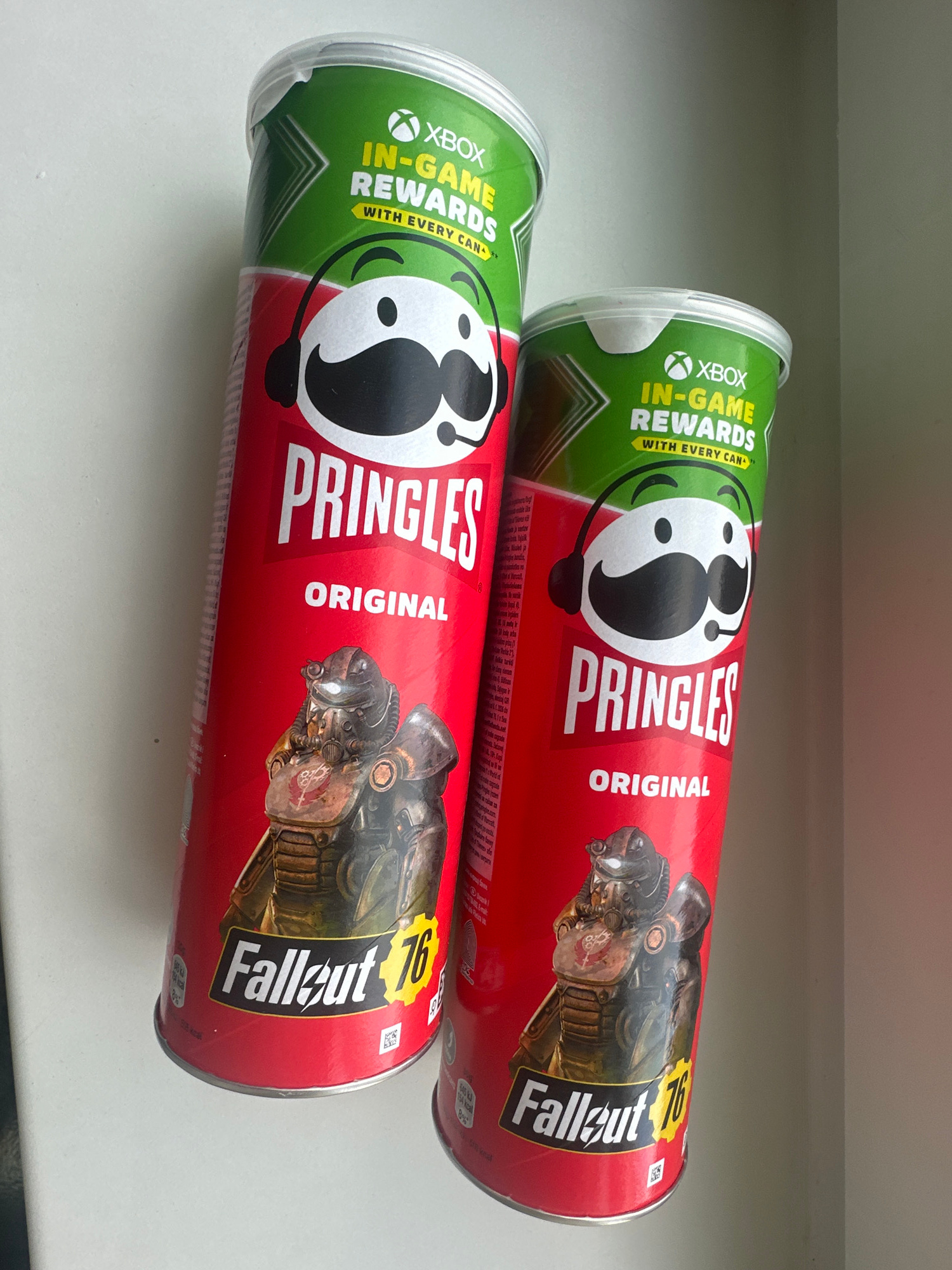 The image shows two cans of Pringles Original chips with Fallout 76 and Xbox branding. The cans are red and green, featuring the Pringles mascot wearing a headset, and the Fallout 76 logo with a charaβ¦read more