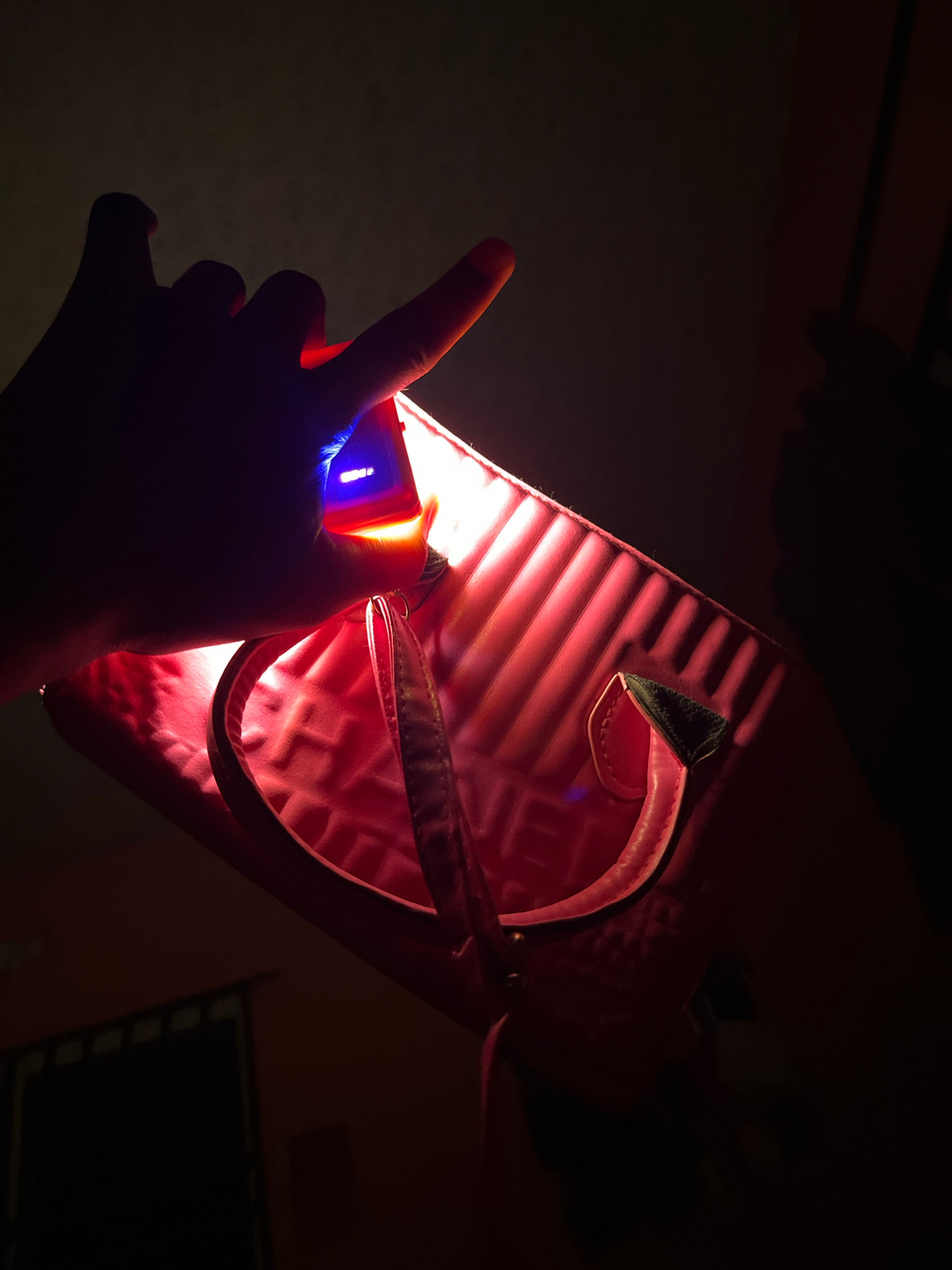A dimly lit indoor scene shows a hand holding a rectangular object with a blue light, illuminating a pink quilted purse. The location in Ado, Nigeria, is not evident from the image.