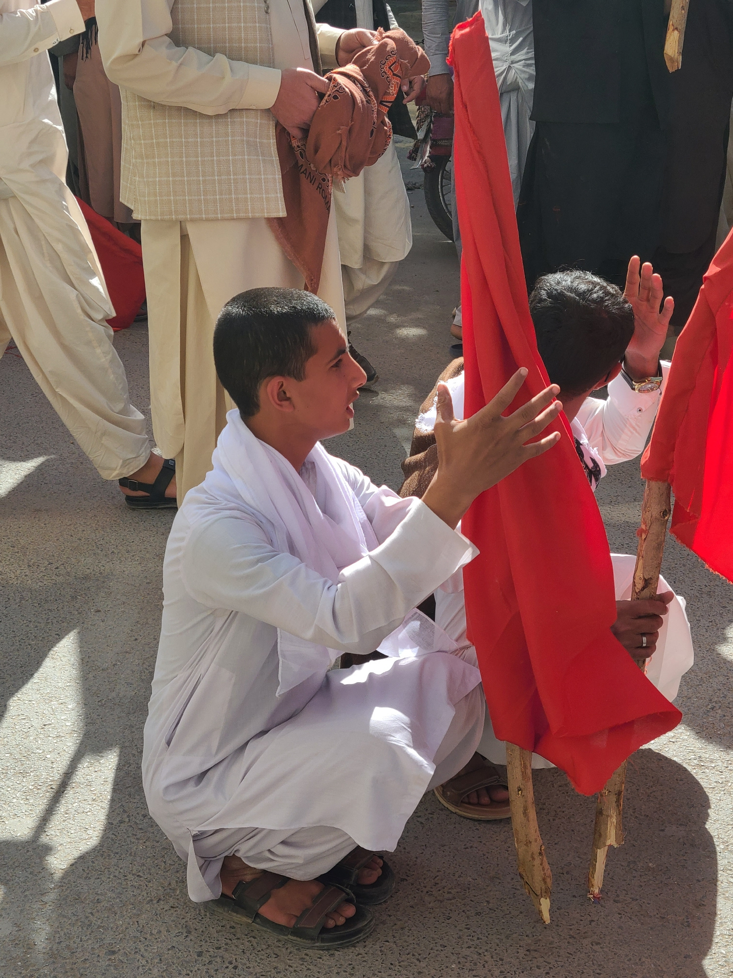 The image shows a group of people in Quetta City Tehsil, Pakistan. Several men are dressed in traditional white clothing, while others wear a mix of white and brown attire. They are holding up red fla…read more