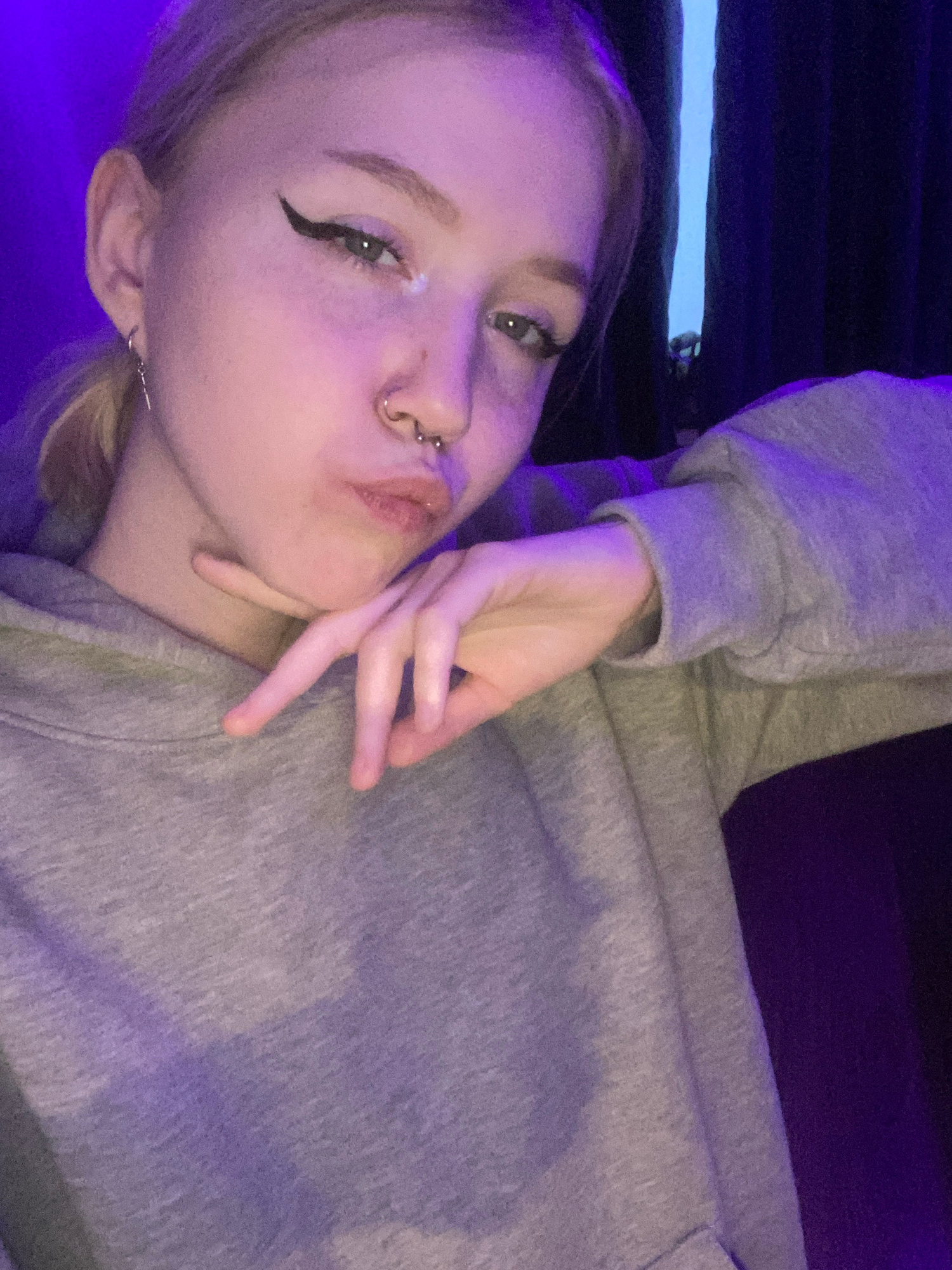 A young woman is posing for a selfie. She is wearing a gray hoodie and has visible eyeliner, a nose ring, and earrings. Her hand is positioned near her face. The background is dark, with some blue and…read more