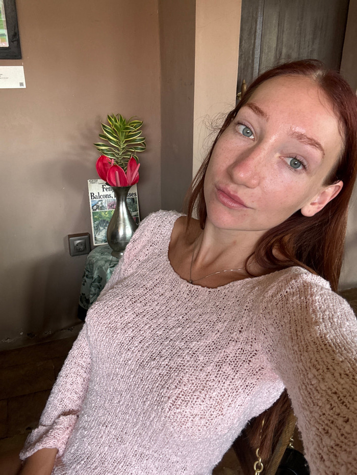 A light-skinned woman with auburn hair and blue eyes takes a selfie. She wears a light pink, textured sweater. A silver necklace graces her collarbone. Behind her, against a brown wall, sits a small p…read more