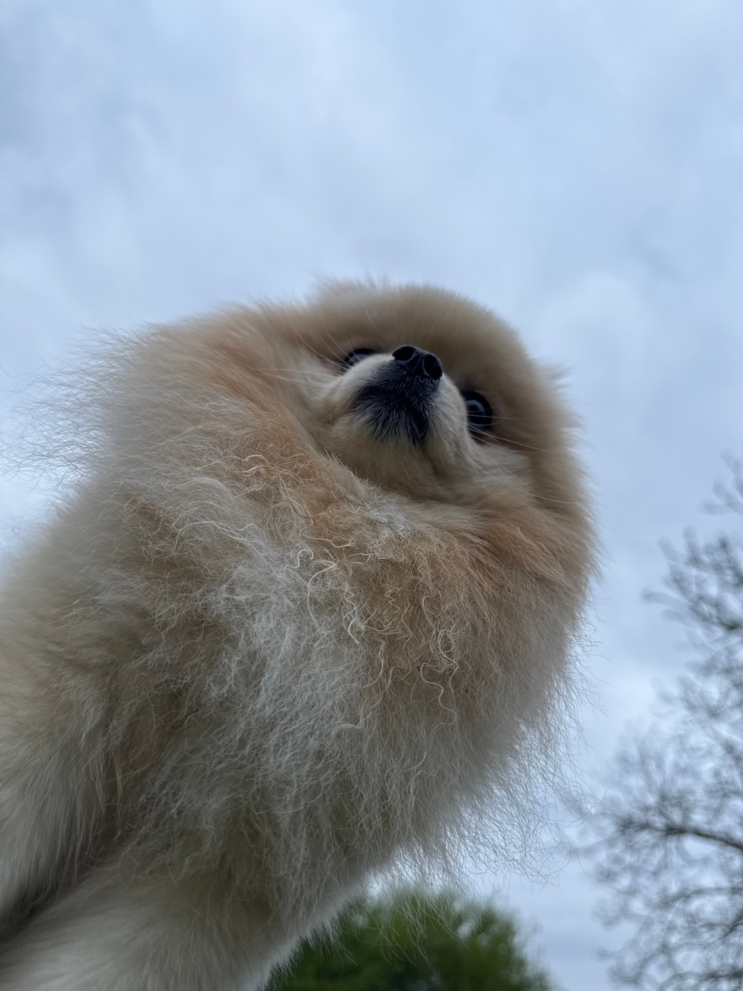 The image shows a low-angle view of a cream-colored Pomeranian dog, with its head tilted to the left. The dog has a black nose, small dark eyes, and fluffy fur. In the background, the sky is overcast…read more