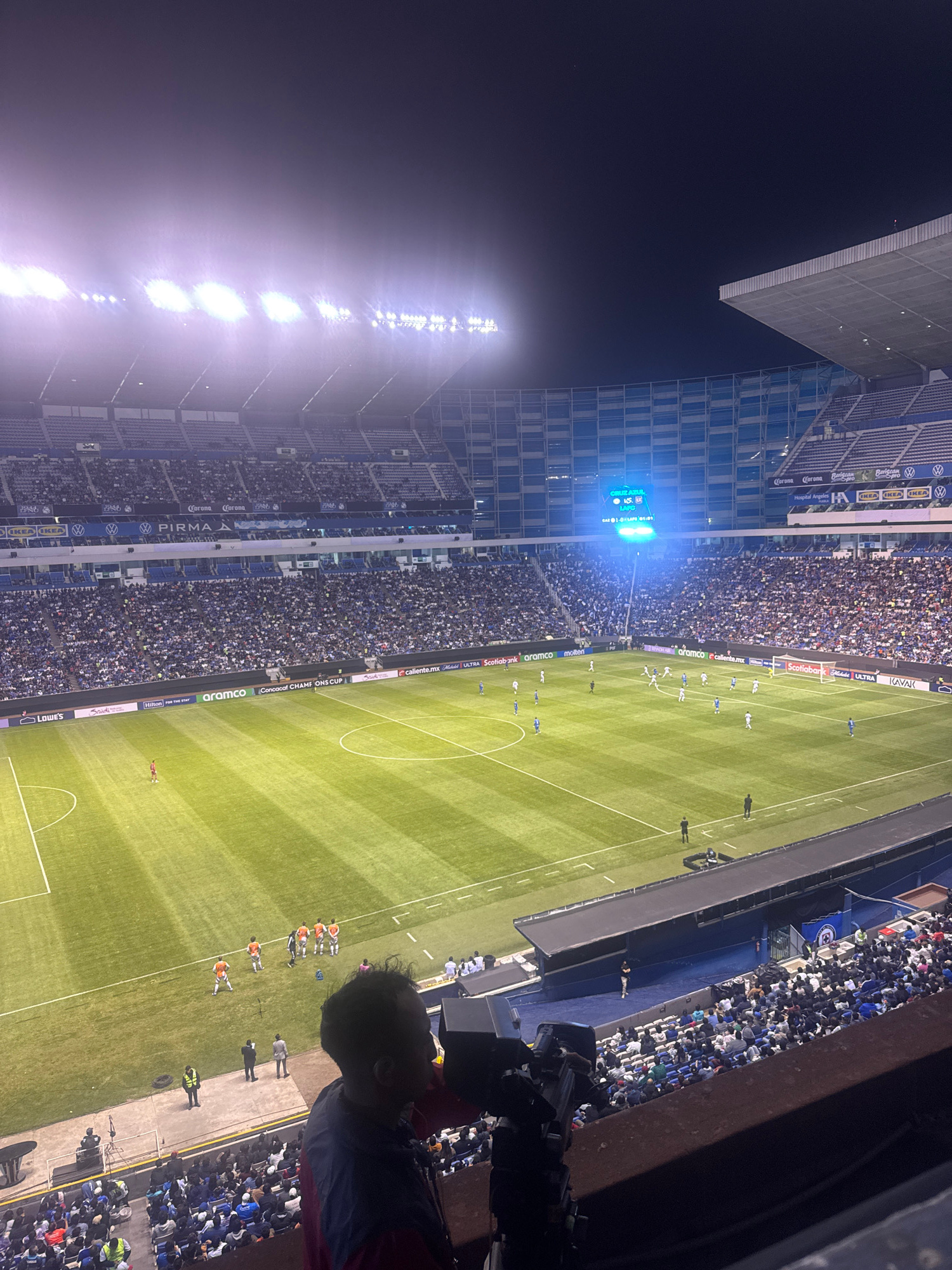 The image shows an overhead view of a soccer stadium at night, densely populated with spectators, likely located in Puebla, Mexico based on the "Cruz Azul" signage on the scoreboard and stadium advert…read more