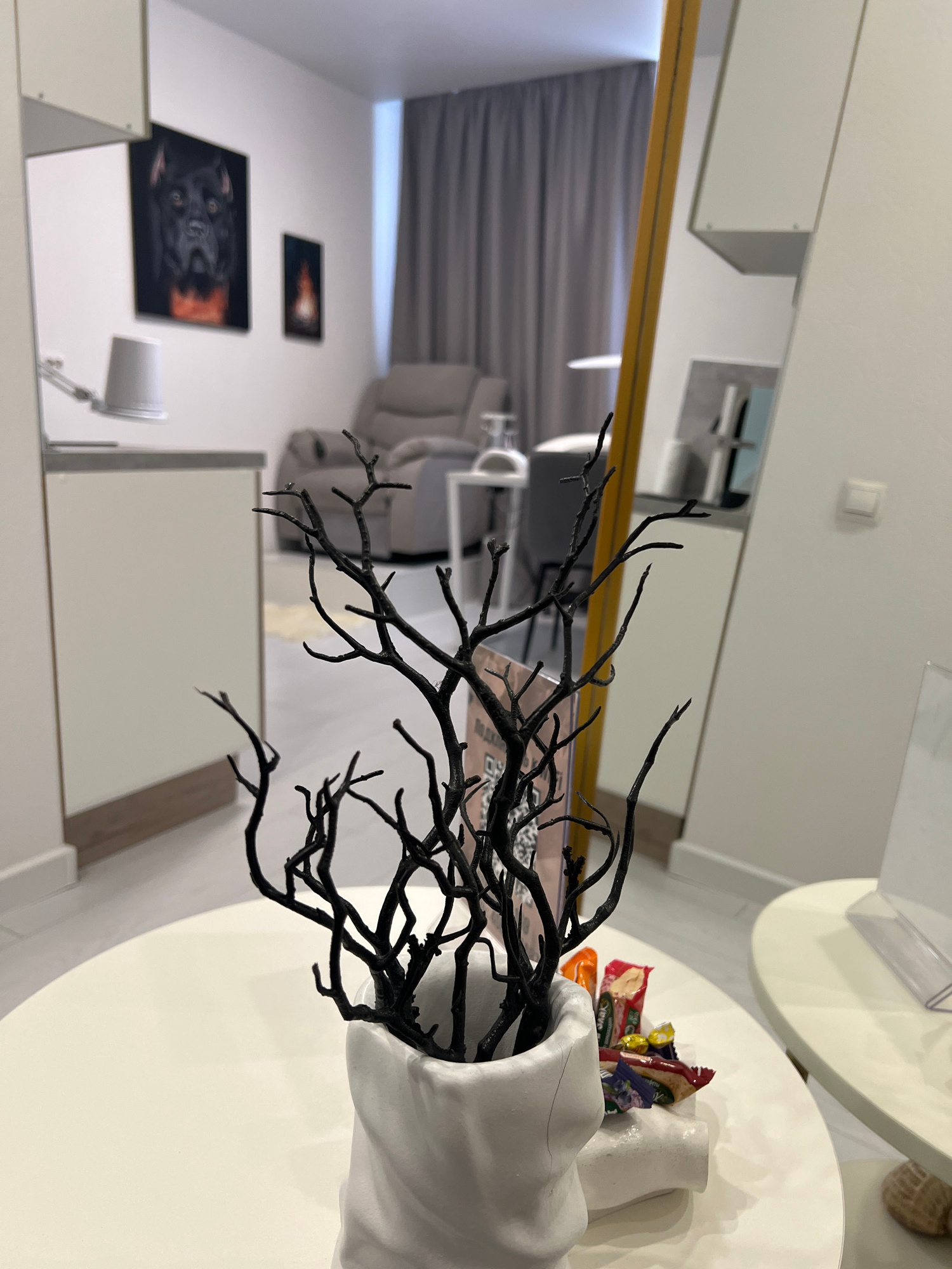 The image shows a contemporary interior with a monochrome color scheme. A white table is in the foreground, featuring a white vase filled with bare, black branches and assorted candies. In the backgro…read more