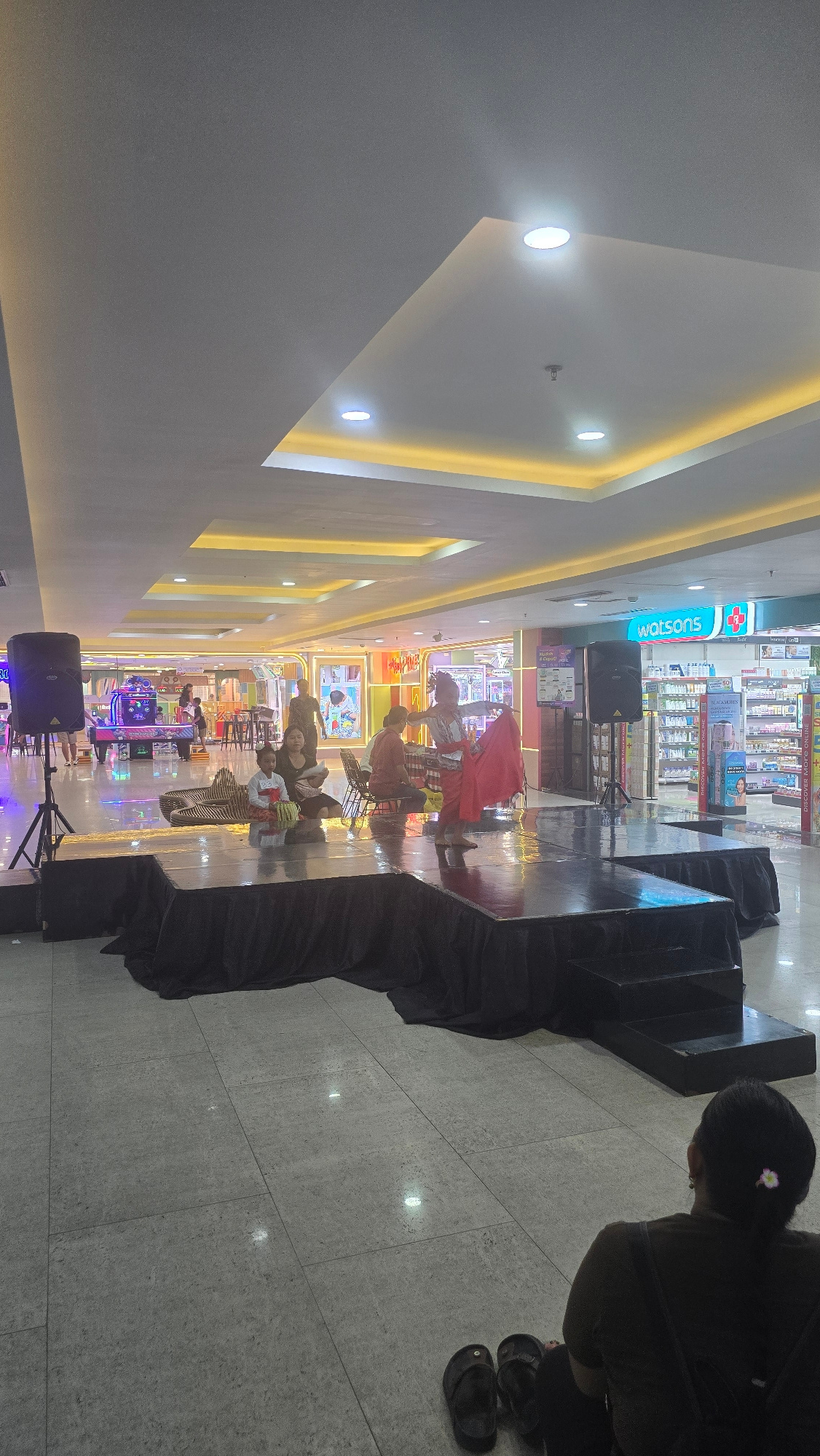 The image depicts a performance or cultural event taking place in a mall in Denpasar, Indonesia. In the background, there is a "Watsons" store. People are seated on the floor watching a dancer perform…read more