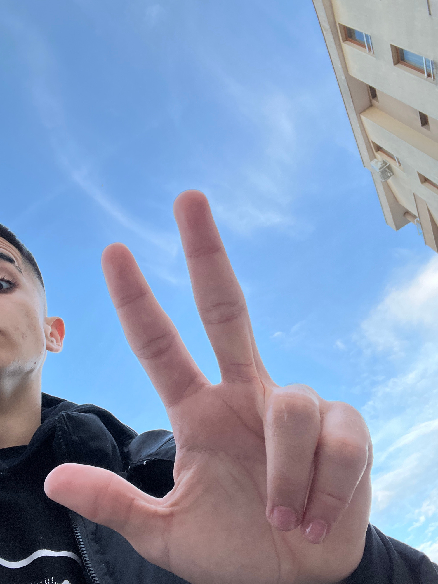 A low-angle, upward-facing photograph shows a person with their right hand raised, forming a "V" or peace sign with their index and middle fingers. The person is wearing a dark-colored jacket, visible…read more