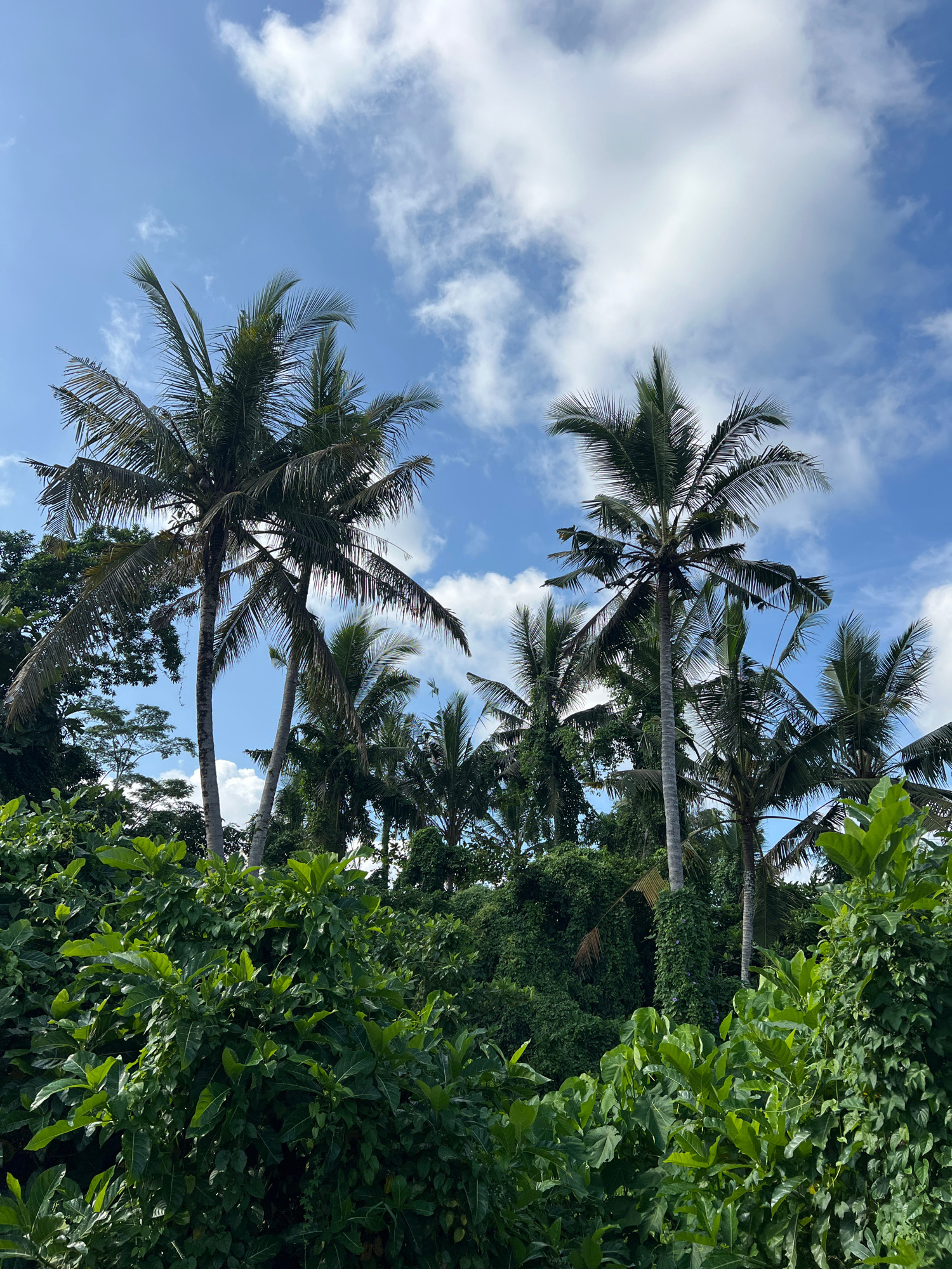The image captures a scene in Peliatan, Indonesia, looking up at palm trees against a blue sky with scattered white clouds. The trunks of the palm trees are visible, along with their fronds. Dense gre…read more
