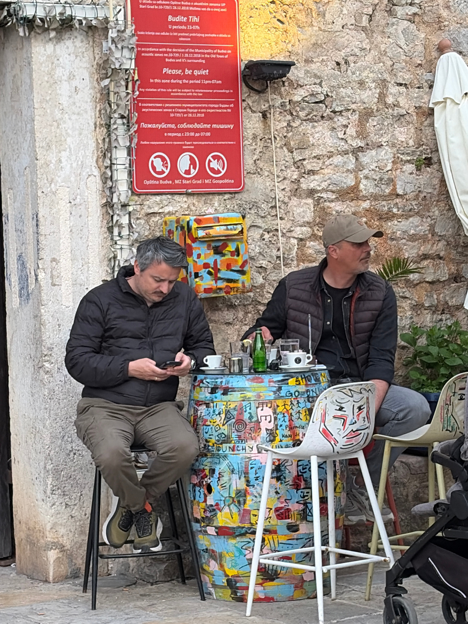 The image depicts a scene in Budva, Montenegro, possibly in the Old Town area, as indicated by a sign concerning noise restrictions ("Budite Tihi," "Please, be quiet"). Two men are seated at a colorfu…read more