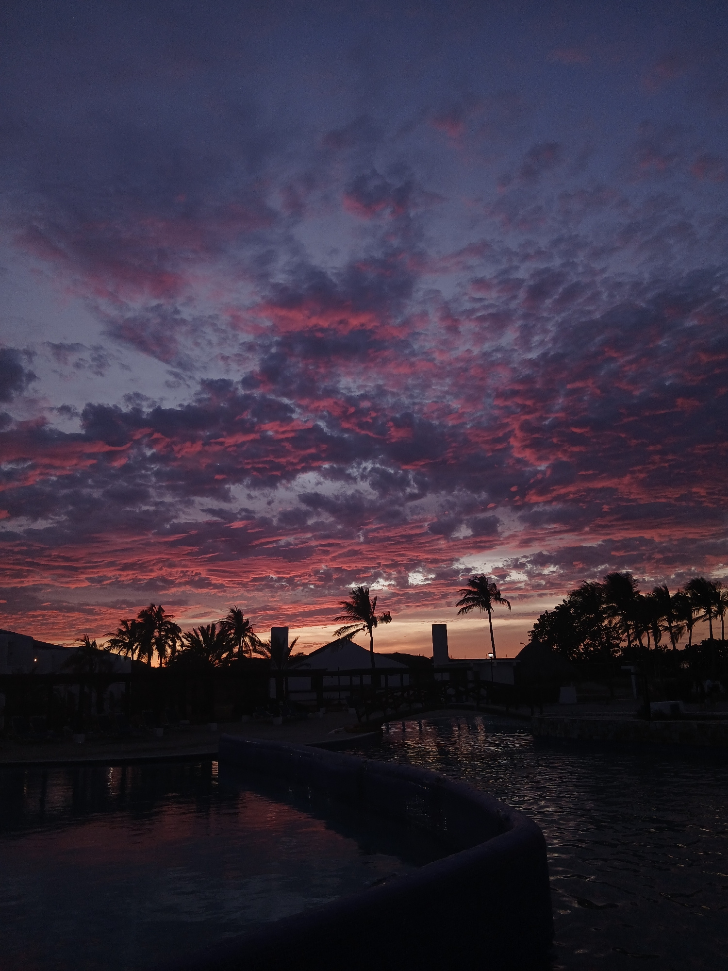 The image depicts a twilight scene in Altagracia, Venezuela. The sky is filled with clouds, predominantly grey and tinged with red hues near the horizon. Silhouette of palm trees and architectural str…read more