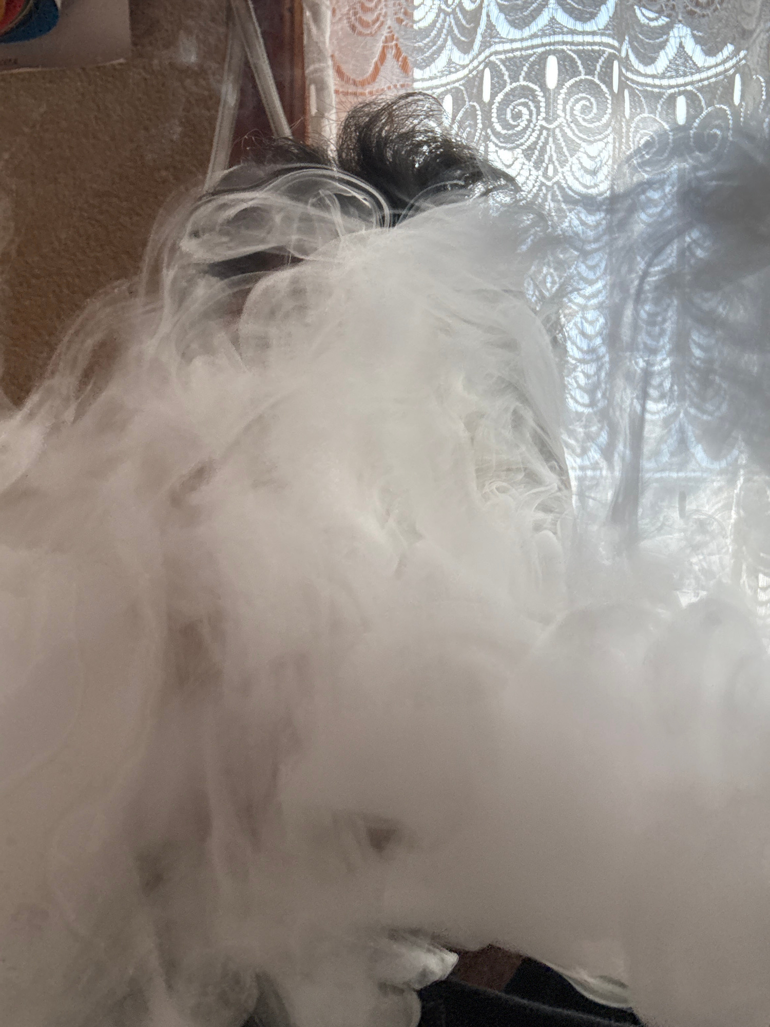 The image depicts a room with smoke filling much of the frame. In the upper left, a window is partially visible behind a lace curtain. Below the window, some dark hair is visible. In the lower foregro…read more