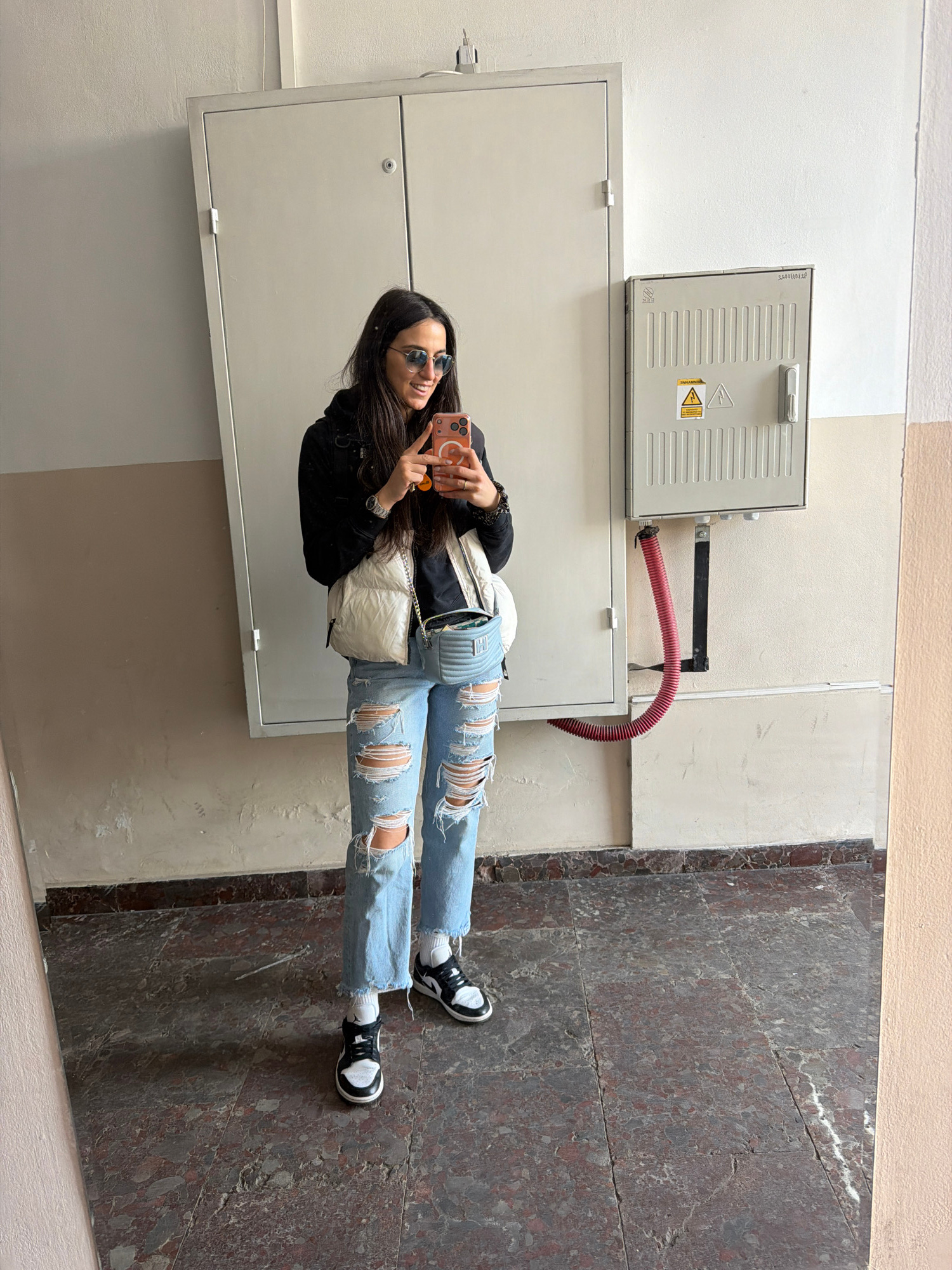 A young woman is reflected in a large metal door, likely of an electrical box, indoors. She is taking a selfie with a smartphone. She wears blue sunglasses, a black jacket, and ripped blue jeans. A wh…read more
