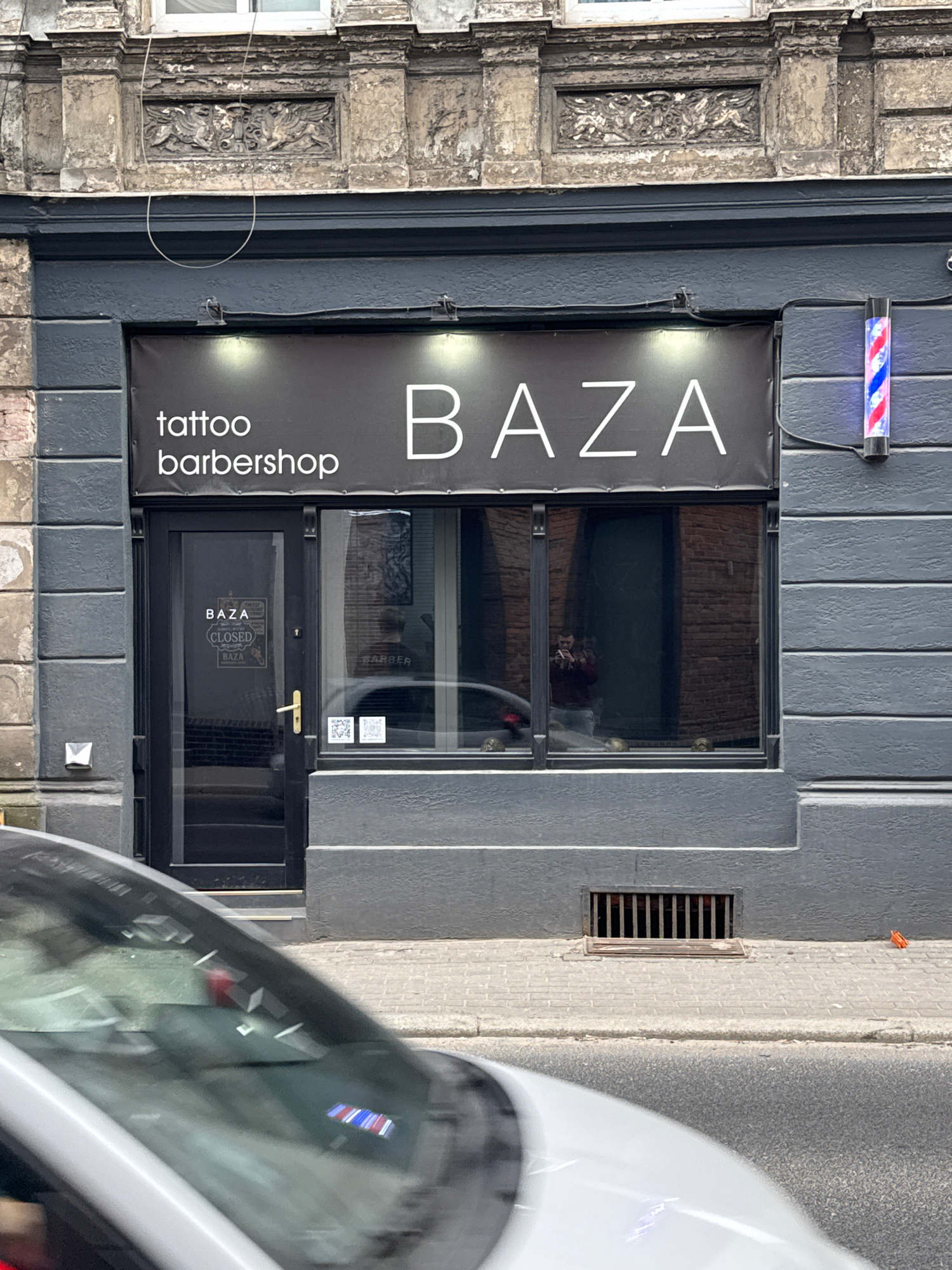 The image captures the front of "BAZA," a tattoo and barbershop located in Bydgoszcz, Poland. The shop's sign is prominently displayed above the entrance, featuring white lettering on a black backgrou…read more