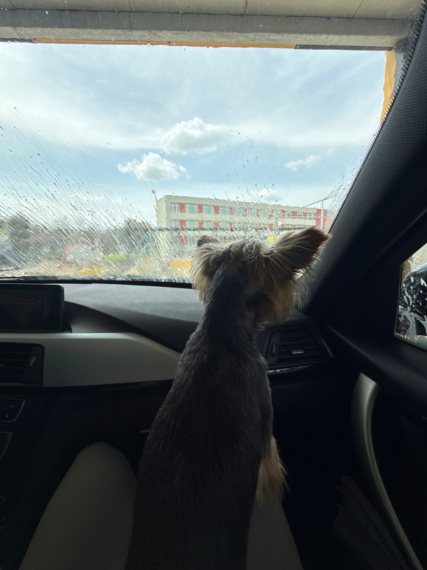 The photo, taken from the interior of a car, shows a small, long-haired dog looking out the driver-side window of a car wash. The sky is visible through the wet window and a multi-story apartment buil…read more