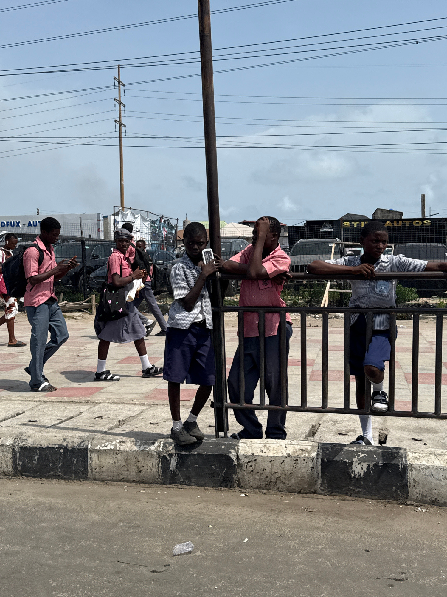 The image shows a group of schoolchildren in Igboefon, Nigeria, dressed in school uniforms and standing along a sidewalk next to a black metal fence. Some of the children are holding or using cell pho…read more