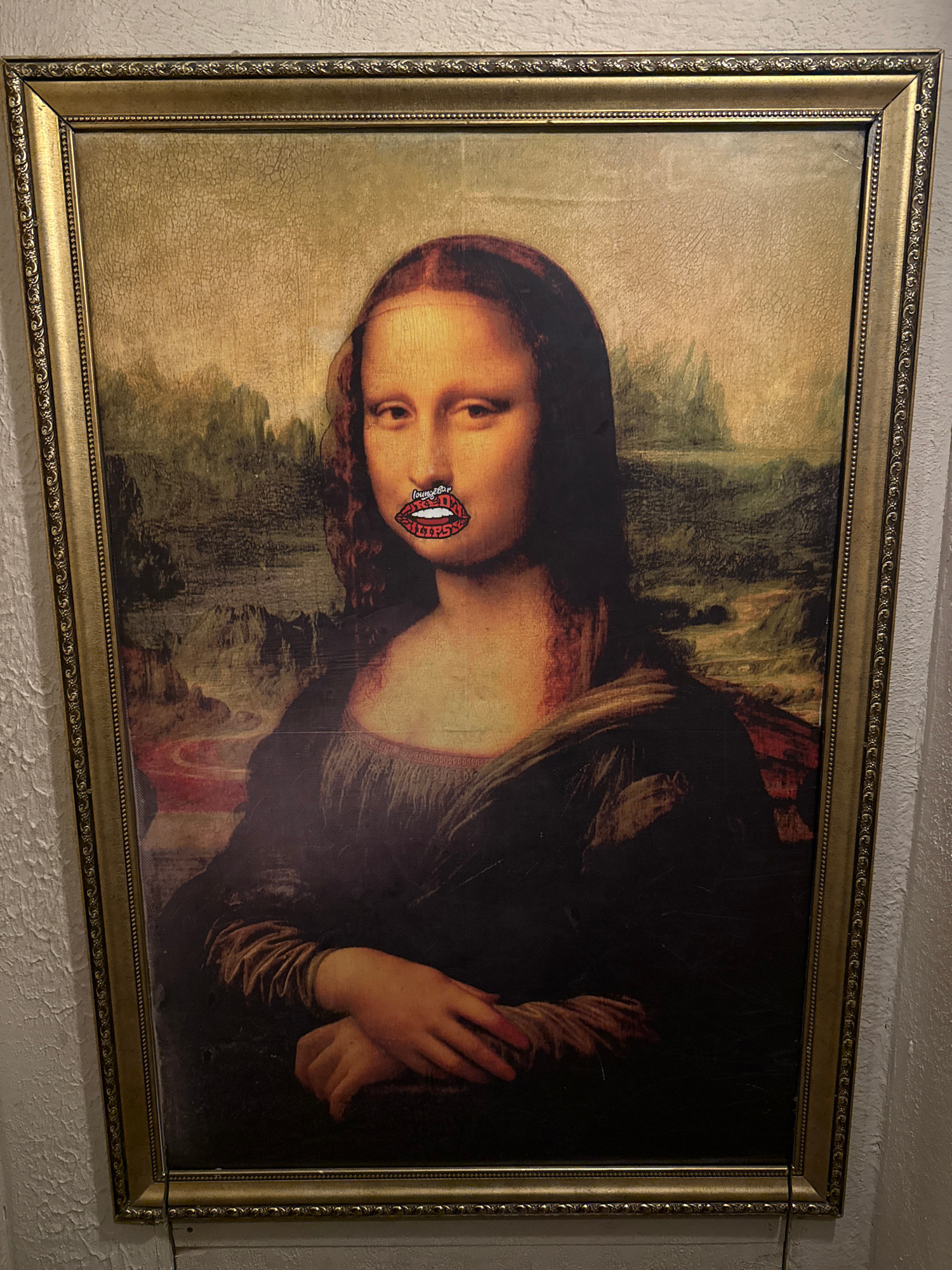 An altered portrait of the Mona Lisa, rotated 90 degrees counter-clockwise, is depicted in a medium shot. The artwork is framed in an ornate, golden frame with decorative patterns. The painting itself…read more