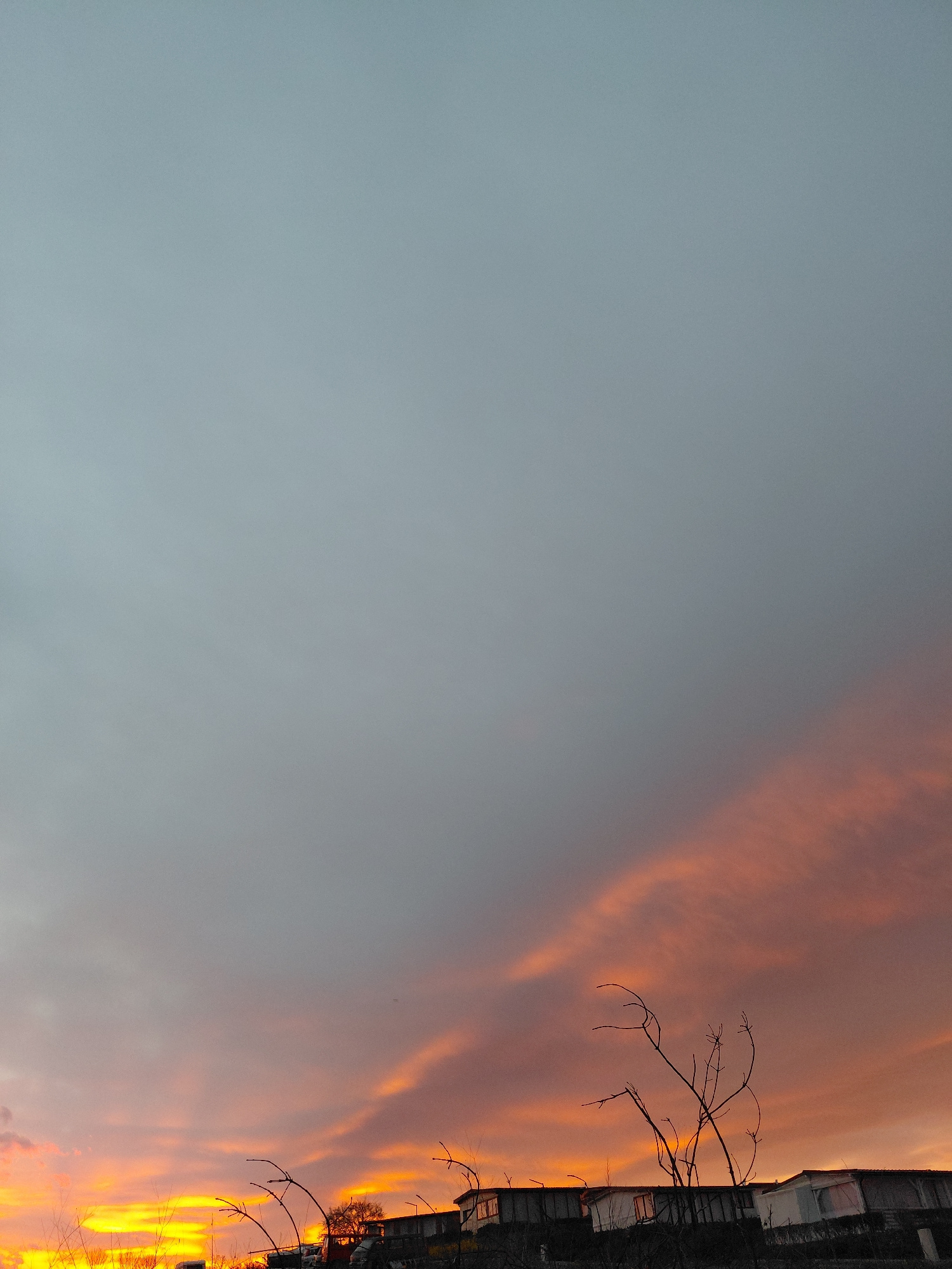 The image depicts a dusk or dawn sky, with the left side showing a clear, pale grey-blue sky and the right side filled with orange and red streaked clouds that resemble a sunset. A silhouette of spars…read more