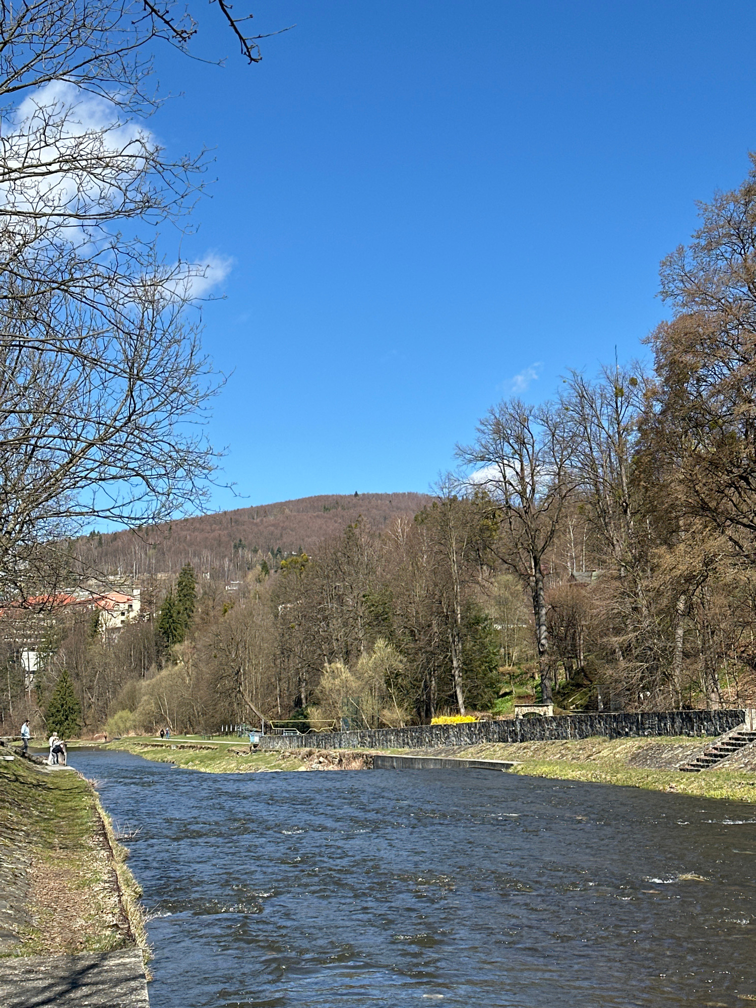 The image depicts a section of the Vistula River flowing through Wisła, Poland. The river runs vertically along the right side of the frame, bordered by stone and grass embankments. On the left, a hil…read more