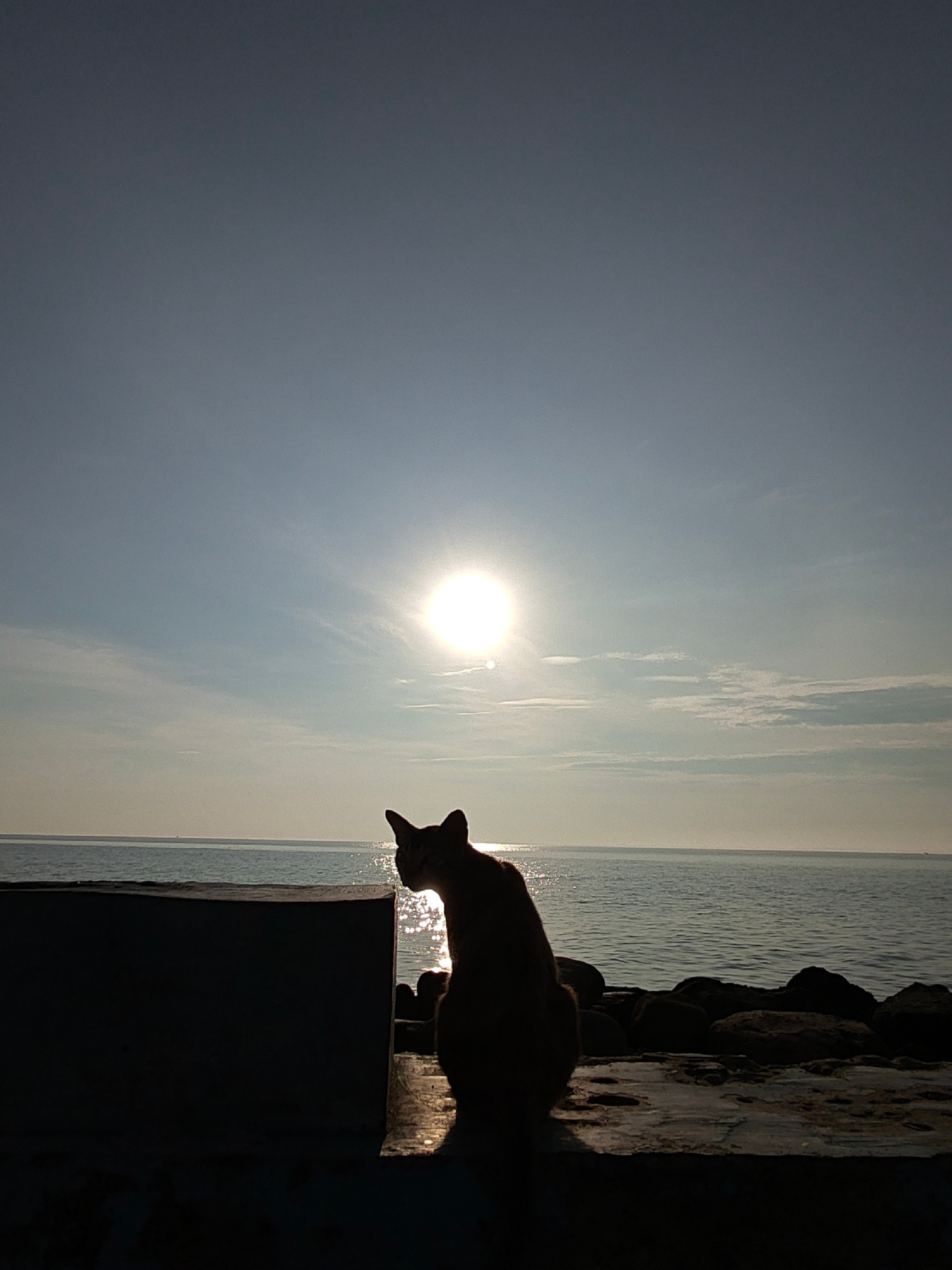 A silhouetted cat sits on a concrete structure overlooking the sea. The sun shines brightly over the water, creating a glare. Some clouds are visible in the sky. The location appears to be a coastal a…read more