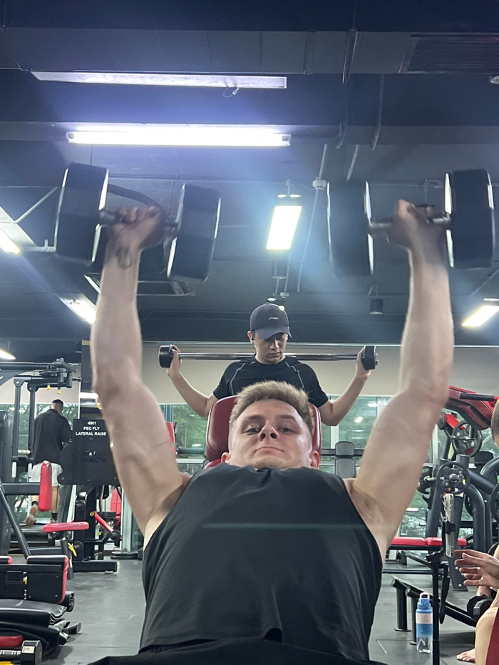 The image captures an indoor gym scene, located in Nha Trang, Vietnam. In the foreground, a Caucasian male with short light-colored hair, wearing a black tank top, lies supine on a red padded weight b…read more
