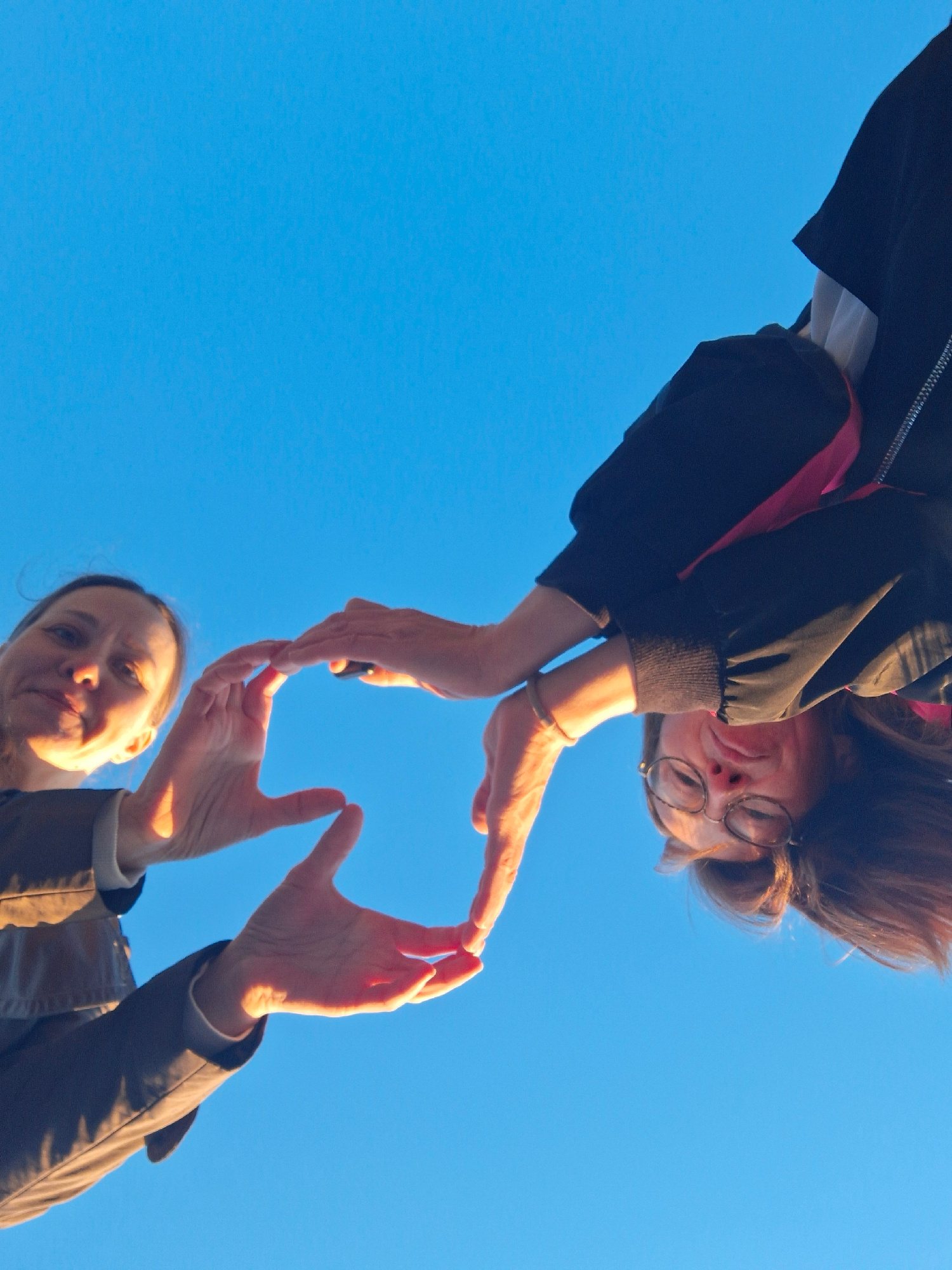 From a low-angle perspective, two individuals are pictured against a clear blue sky. The person above is wearing glasses and a jacket with a pink accent. The person below is wearing a brown jacket. Th…read more