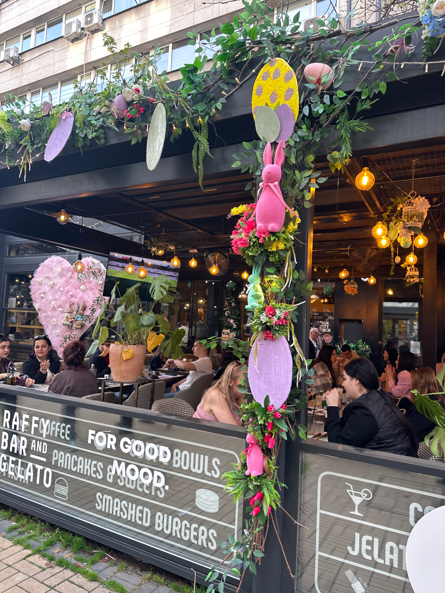 The image shows the exterior of a restaurant in Sofia, Bulgaria, with an Easter-themed garland decorated with faux eggs, flowers, and a bunny, hanging above the entrance. The garland also includes gre…read more