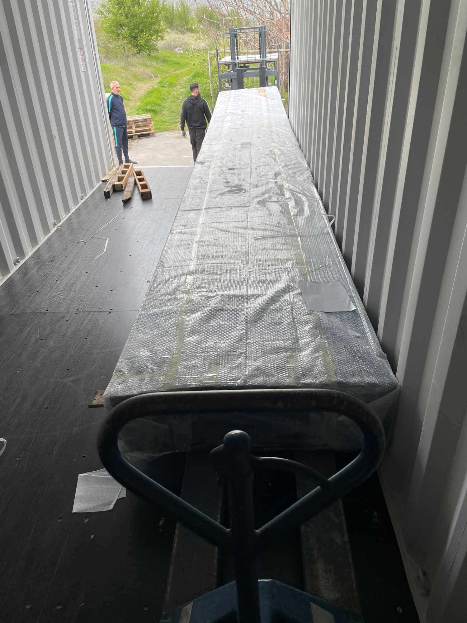 The image shows the interior of a shipping container, seemingly during a loading or unloading process. The container has ribbed metal walls and a wood-paneled floor. A long, rectangular object wrapped…read more