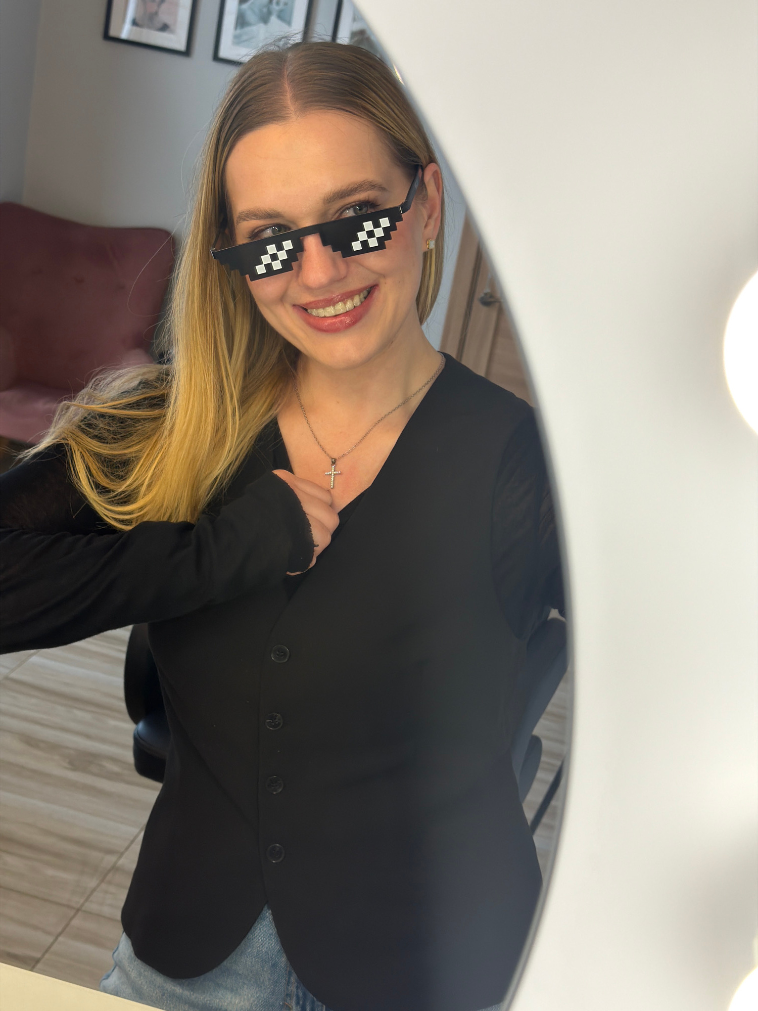A young woman with long, straight blonde hair and fair skin is captured in a mirror reflection, smiling broadly with her teeth showing. She wears distinctive black, pixelated "Thug Life" style sunglas…read more