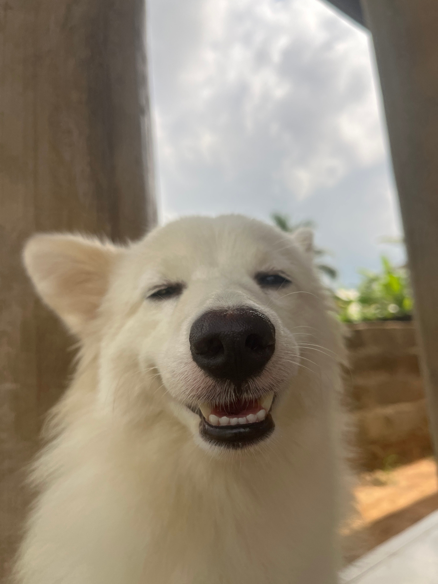 A close-up shot of a white dog with its head tilted, revealing its teeth. The background shows a cloudy sky and some greenery. The location in Ikot Ekpene, Nigeria cannot be determined from the image.
