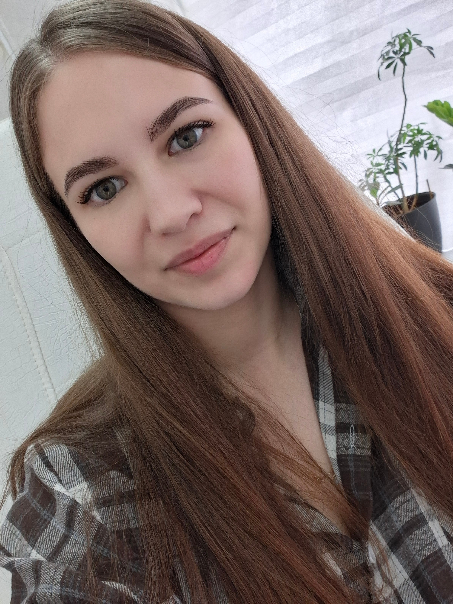 A young woman with long brown hair poses for a selfie. She is wearing a plaid shirt. Her skin is light, and she has light-colored eyes. A small potted plant is visible in the lower right corner of the…read more