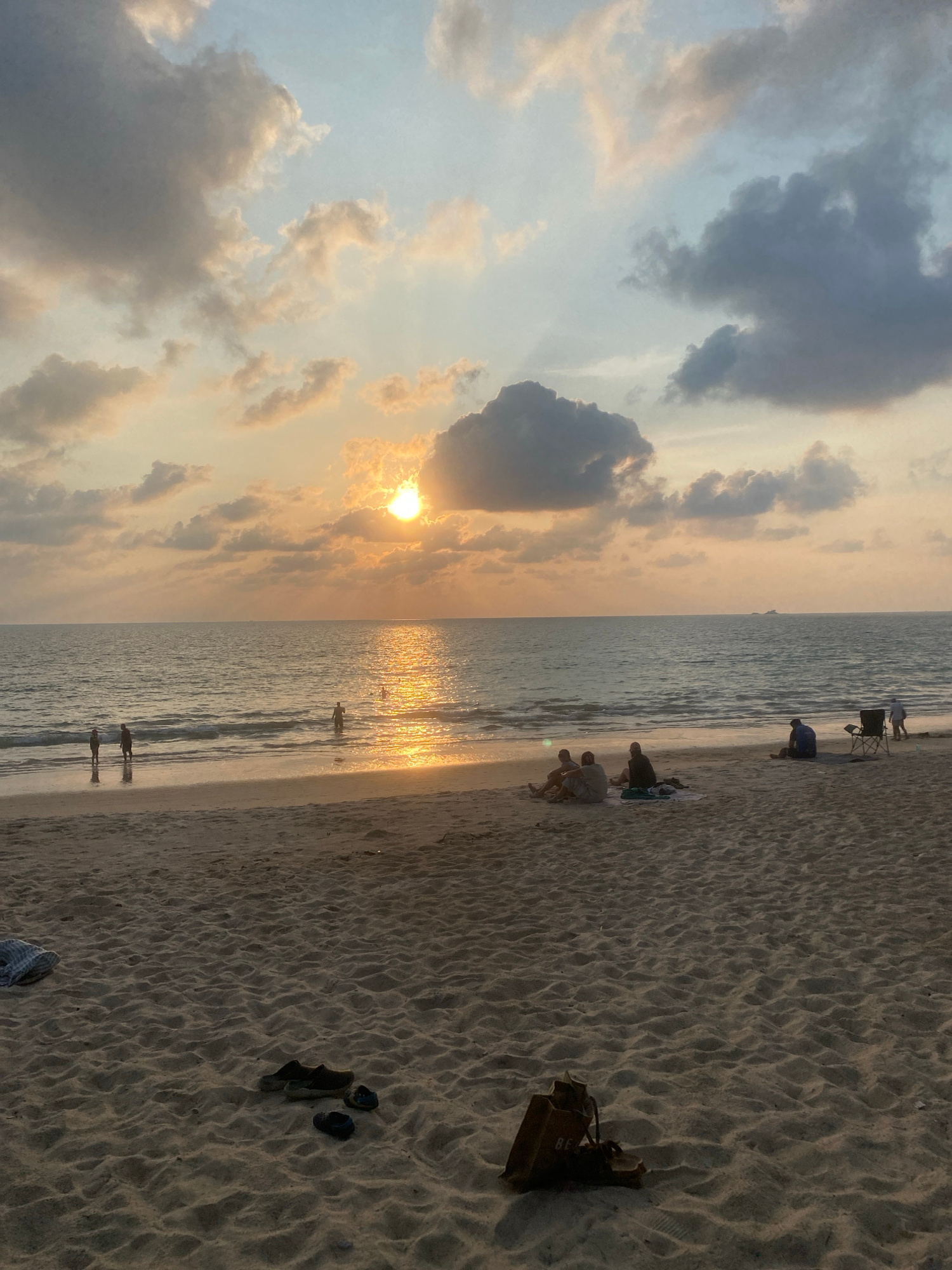 The image displays a serene beach scene at sunset in Choeng Thale, Thailand. The sun, a bright golden orb, is low on the horizon and partially obscured by scattered clouds, casting a warm, radiant glo…read more