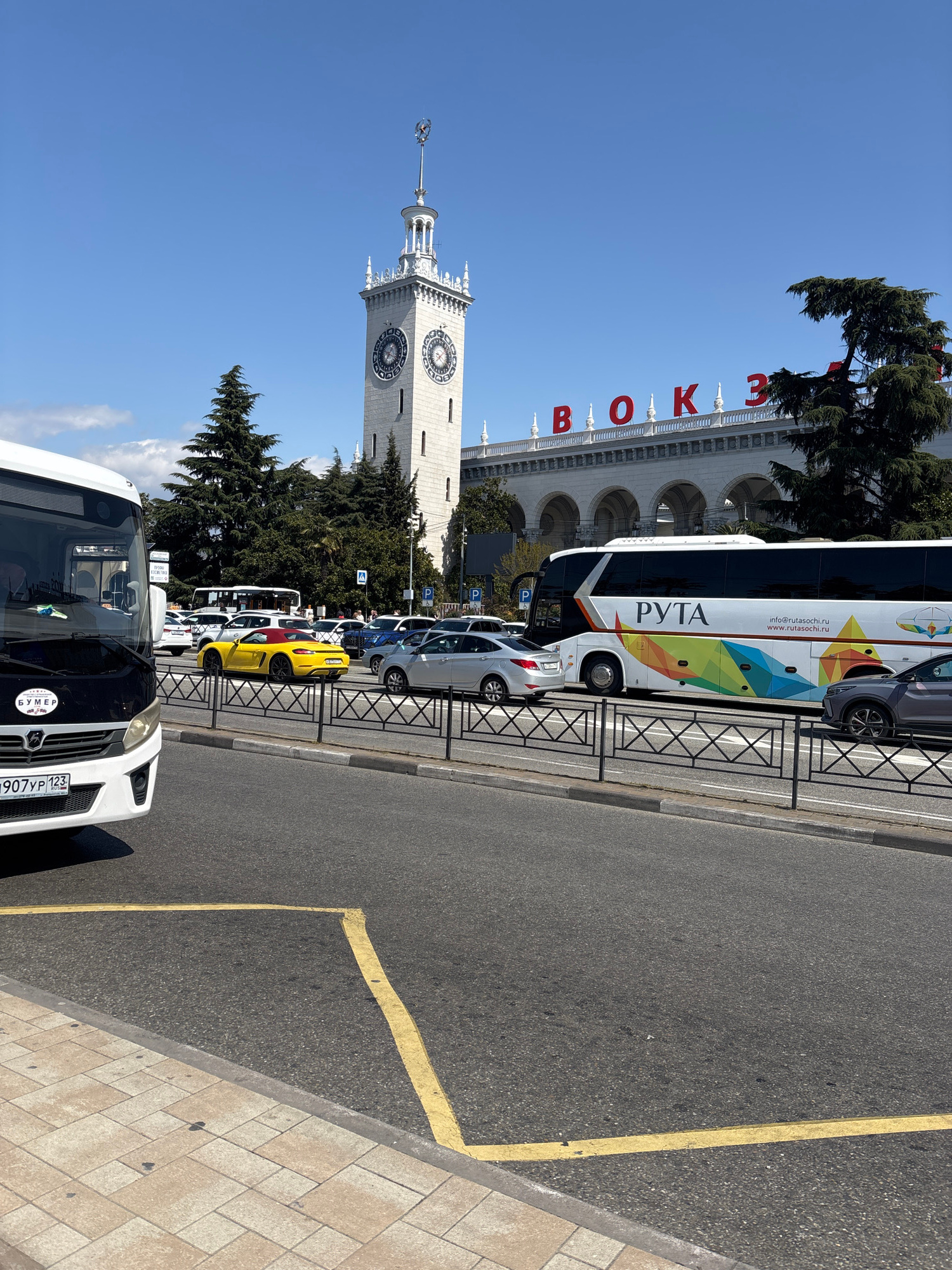 The image shows a view of Sochi, Russia, featuring the Sochi Sea Port building prominently. The building is white with arched windows and a clock tower. The word "ВОКЗАЛ" is displayed in red on the bu…read more