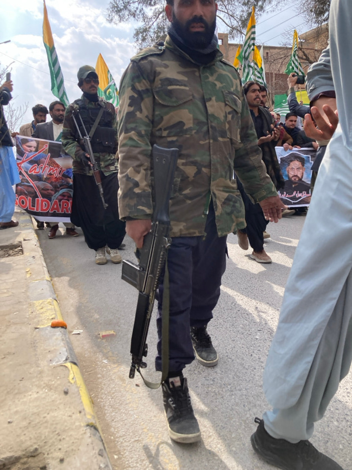 The image displays a daytime street procession in Quetta City Tehsil, Pakistan. In the foreground, a male with a dark beard and short dark hair, wearing a camouflage jacket, dark trousers, and dark sneakers, holds a black G3-pattern rifle vertically in his right hand, barrel pointed downwards. To his immediate right, the lower portion of another individual in light blue shalwar kameez and dark sneakers is visible. Behind these figures, a column of multiple males marches. One participant in camouflage attire and dark sunglasses carries an AK-pattern rifle across his chest. The procession features two prominent banners: a white banner with "Kashmir SOLIDARITY" in red text over an image of women and children, and a black banner bearing the portrait of a bearded man in a dark turban, with Urdu/Arabic script below. Numerous green and yellow flags, some adorned with white calligraphy, are carried on poles. Participants are dressed in a mix of traditional shalwar kameez and military-style clothing. The scene takes place on an asphalt road with a concrete curb, partially painted yellow, visible on the left side where some minor debris is present. The background shows light-colored buildings and sparse trees under a bright, partly cloudy sky. | Open Wire