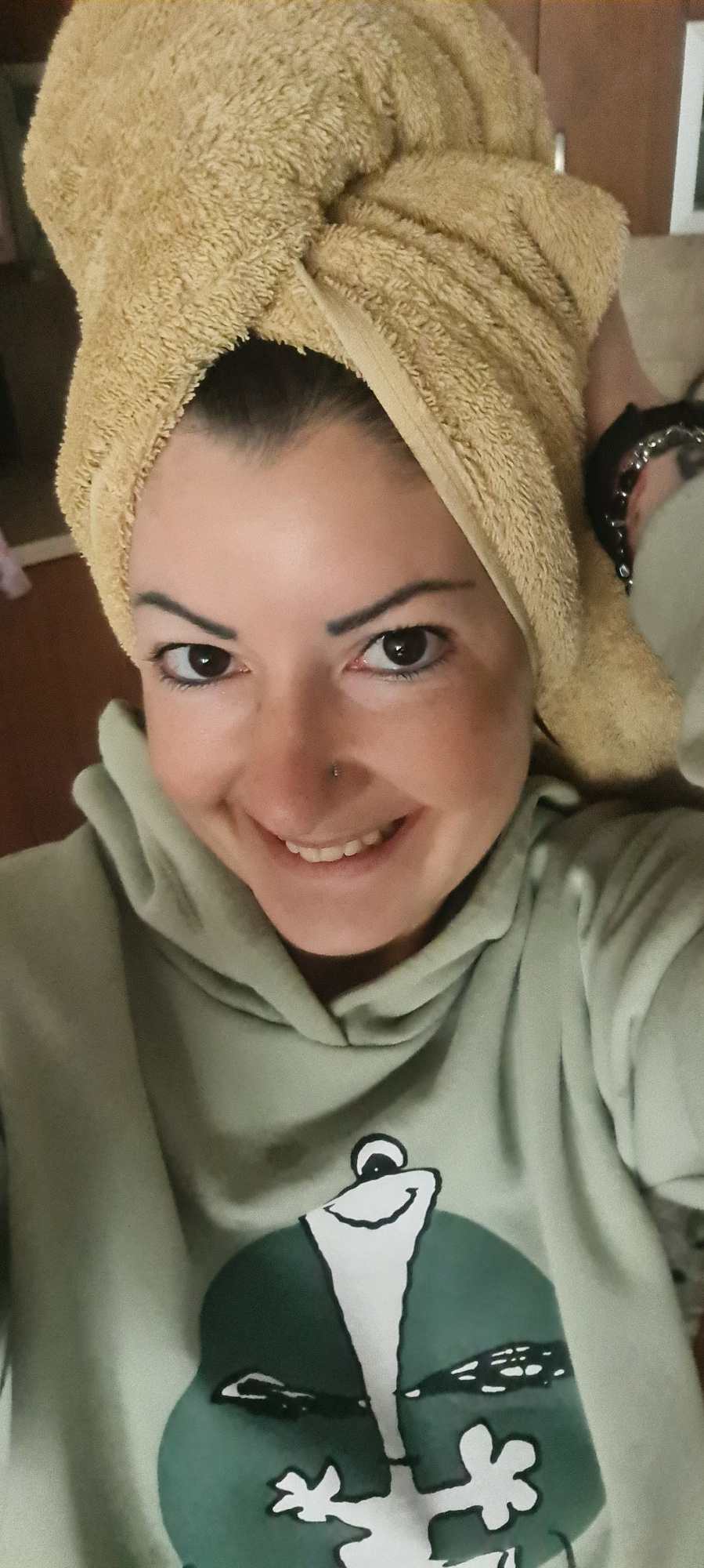 A woman with dark hair wrapped in a tan towel is posing indoors. She is wearing a light green hoodie featuring a cartoon graphic. The woman is smiling slightly, and she has a nose piercing. A bracelet…read more