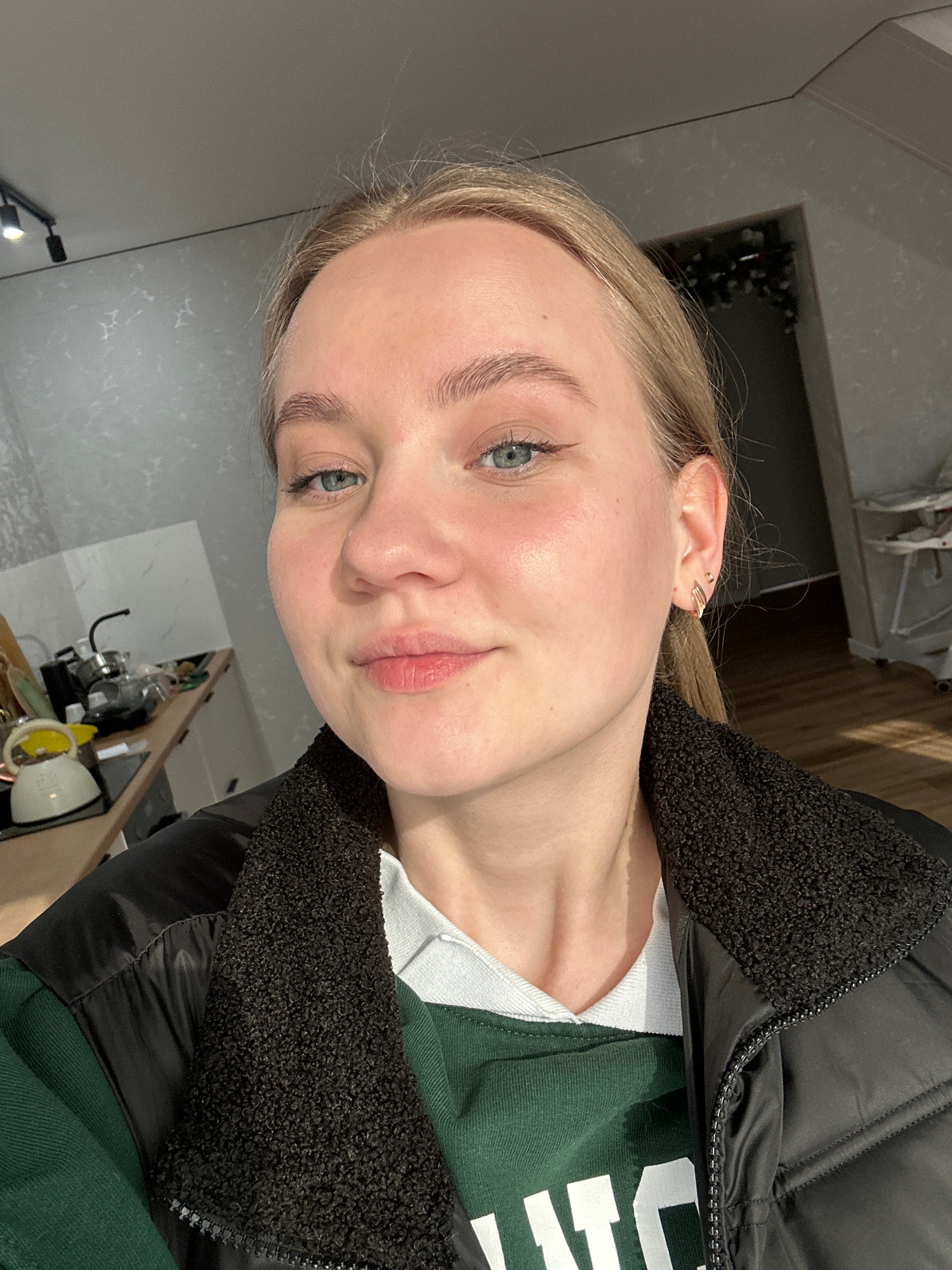 An indoor, close-up portrait shows a young woman with fair skin, light blonde hair, and blue-green eyes, looking directly at the camera with a gentle, slightly smiling expression. She has well-groomed…read more