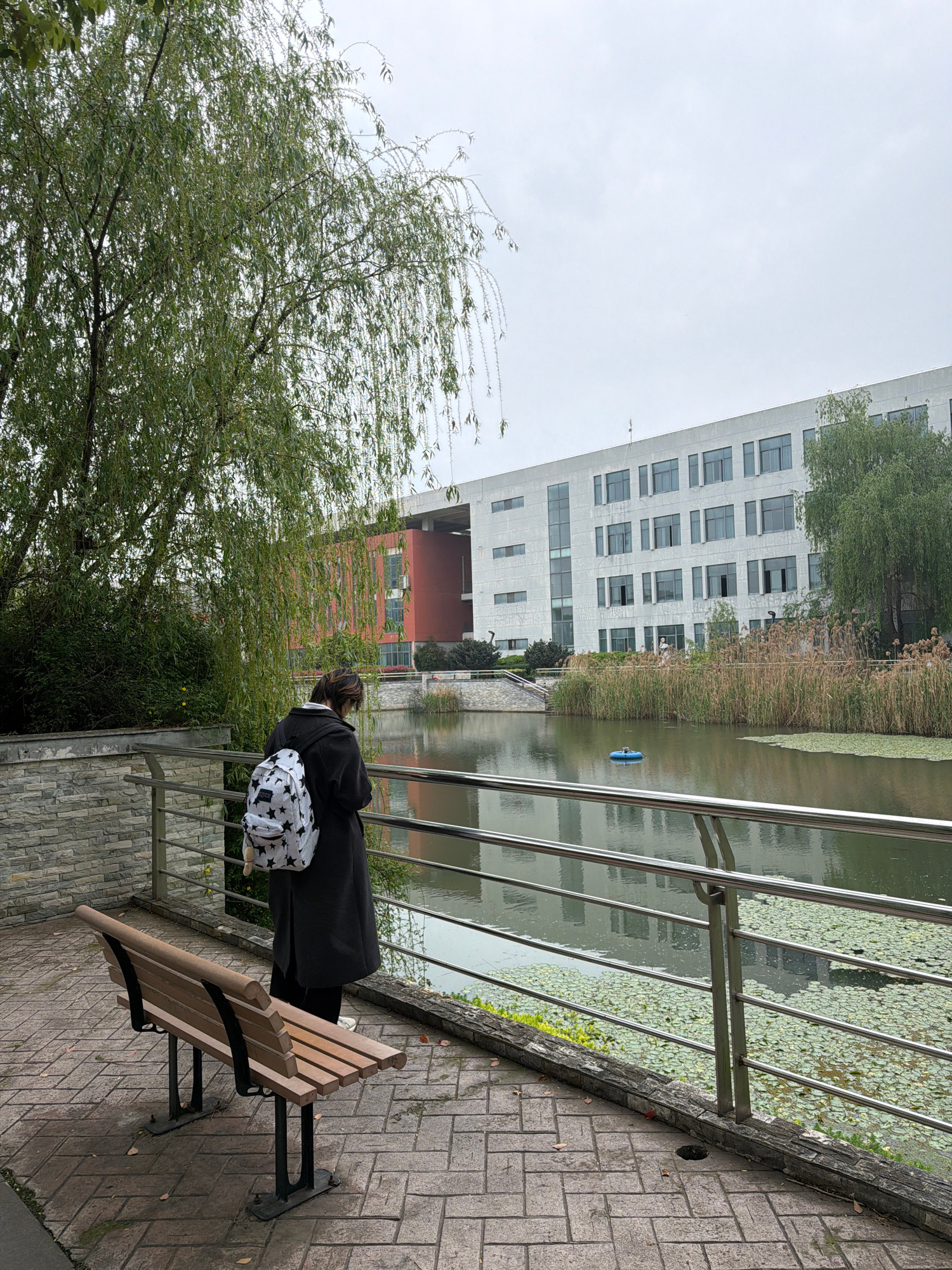 A medium shot captures a person standing behind a park bench along a river or canal in Jiangning District, China. The person, wearing a black coat and carrying a white backpack with black stars, stand…read more