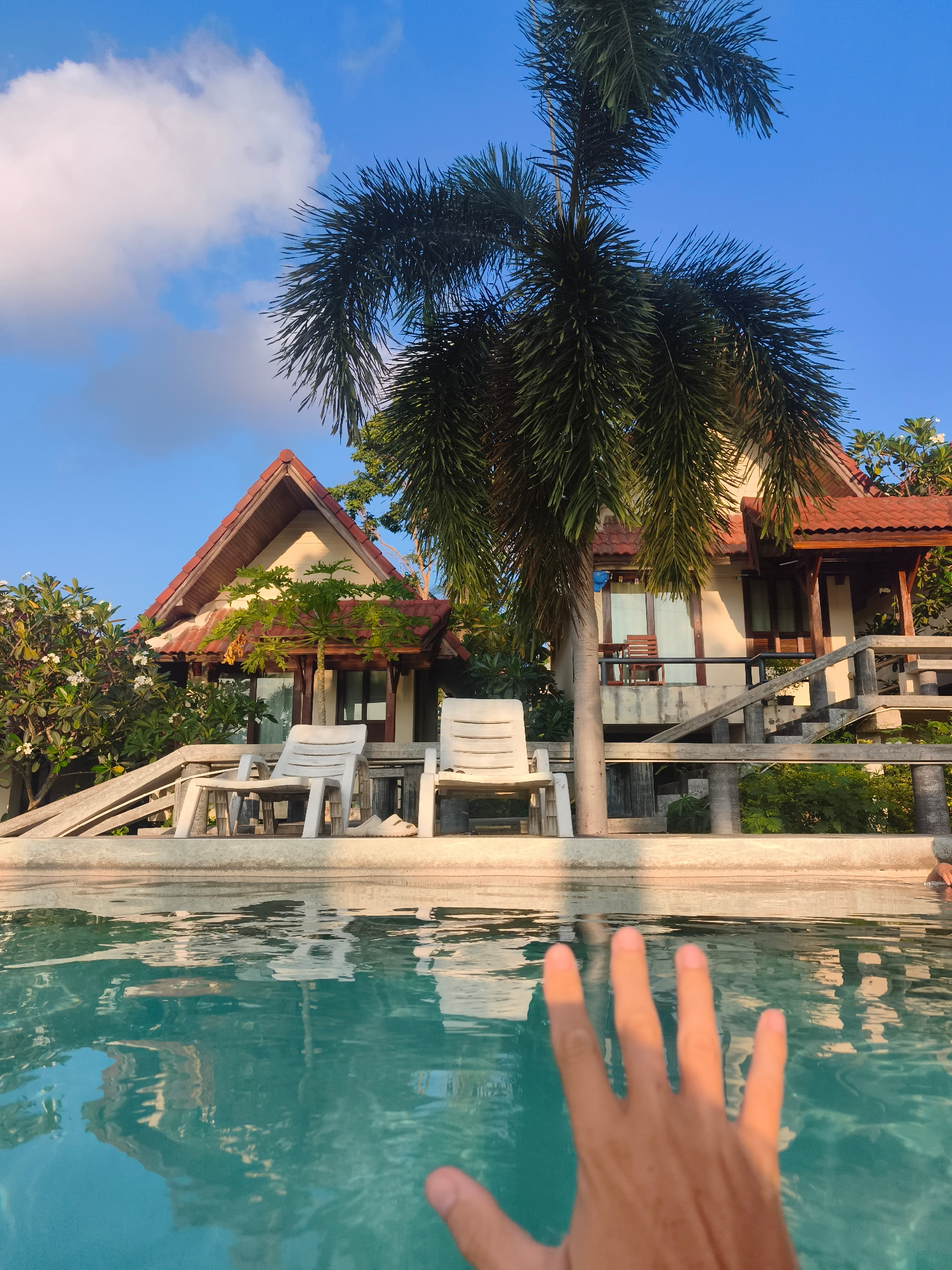 The image captures a first-person view from a swimming pool at what appears to be a tropical resort, likely in บ้านบางรักษ์, Thailand. In the immediate foreground, a person's hand is partially submerg…read more