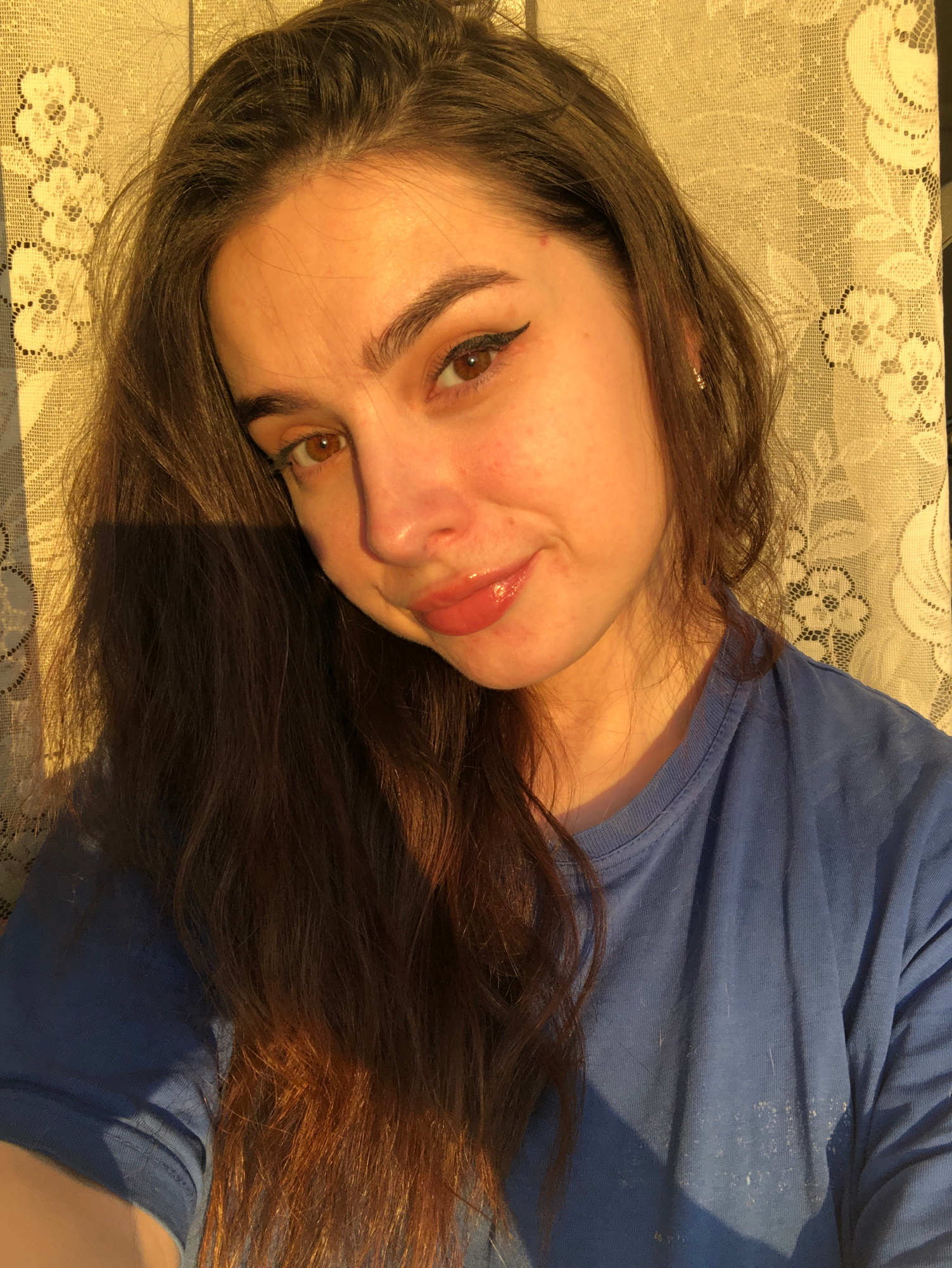 A young woman with long brown hair, brown eyes, and light skin is reclining on a surface covered with a white floral lace tablecloth. She is wearing a blue t-shirt and eyeliner. Sunlight illuminates t…read more