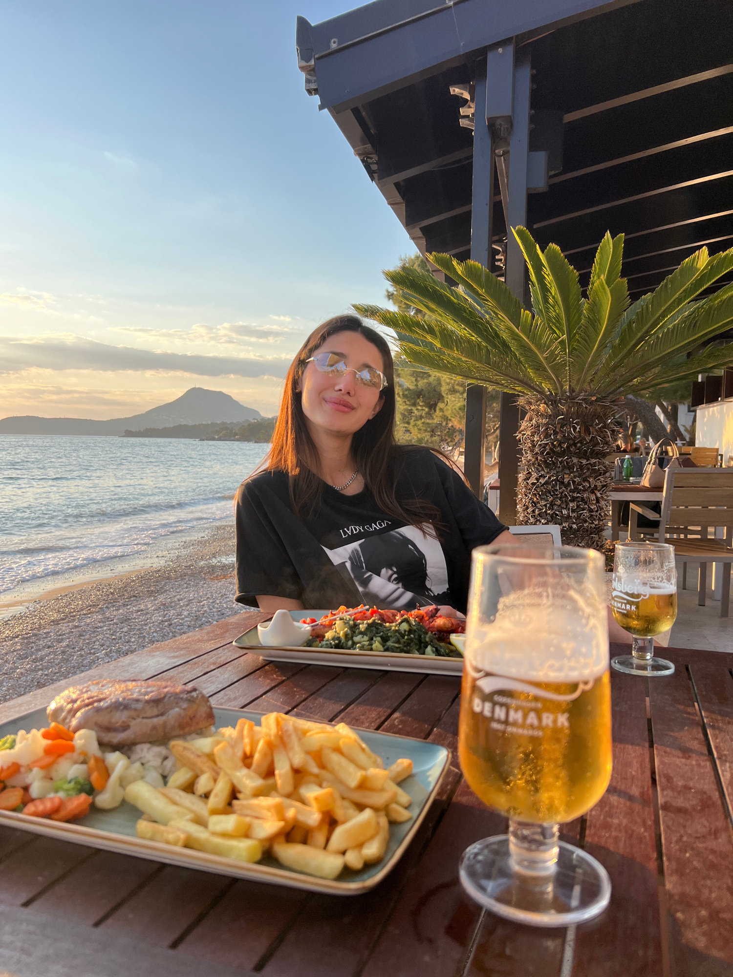 A woman is seated at a wooden table outdoors, with a partial view of a coastline at sunset in the background, likely in the city of Bar, Montenegro. She is wearing sunglasses and a dark shirt. On the…read more