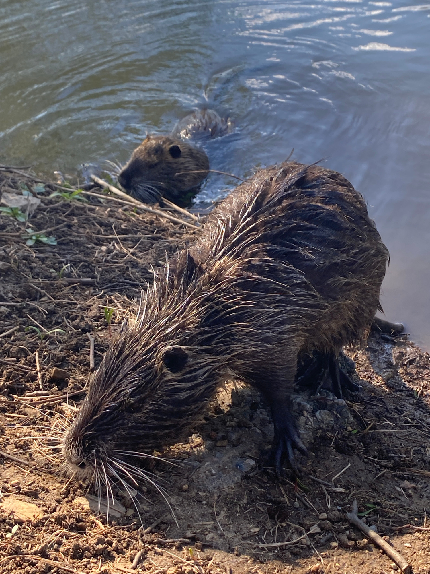 A photograph captures two nutria, one partially submerged in water along a bank of what appears to be a pond or lake. The other nutria is on the bank, seemingly out of the water. The terrestrial nutriβ¦read more