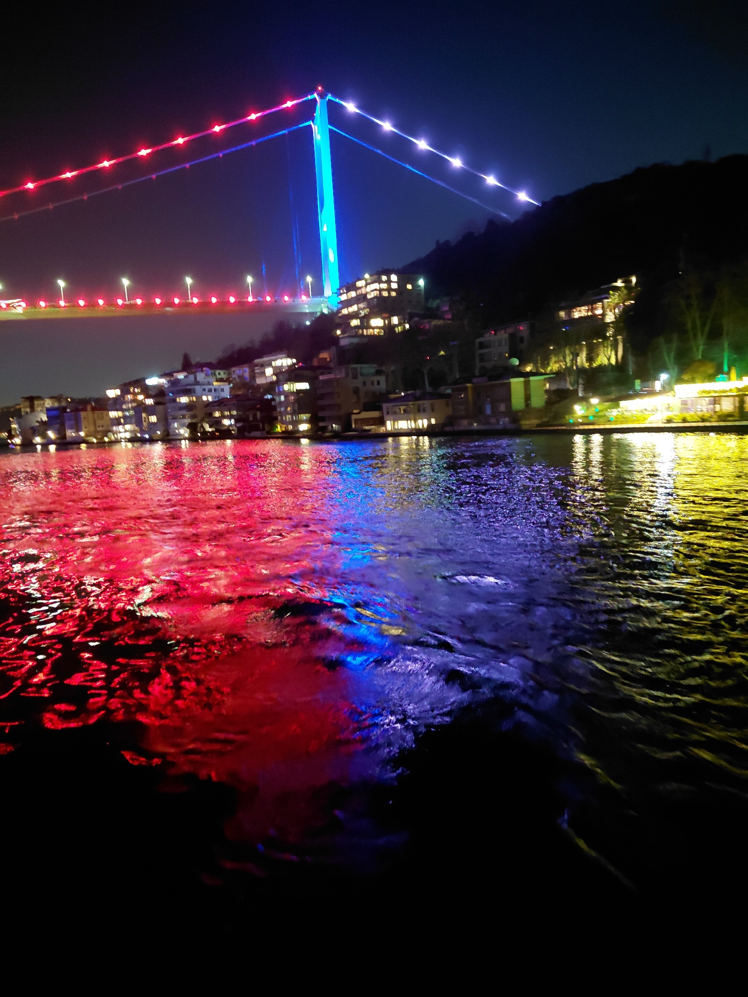 The image depicts a night scene in Sarıyer, Turkey, showcasing the illuminated Fatih Sultan Mehmet Bridge reflected in the water. The bridge is adorned with blue and red lights, its structure visible…read more