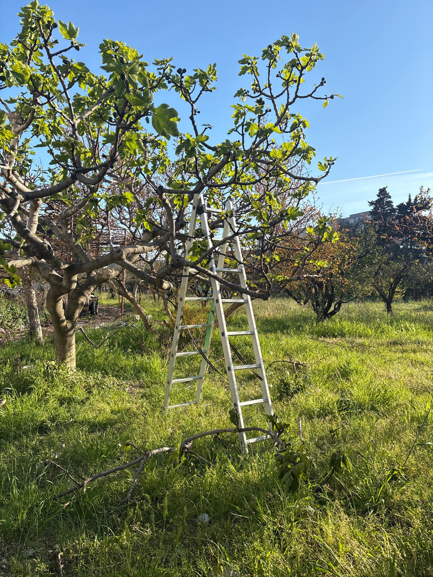 A silver ladder is leaning against a tree in a grassy field near Bar, Montenegro. The tree is covered in green leaves and small fruits. There are other trees in the background, and the sky is blue. Th…read more