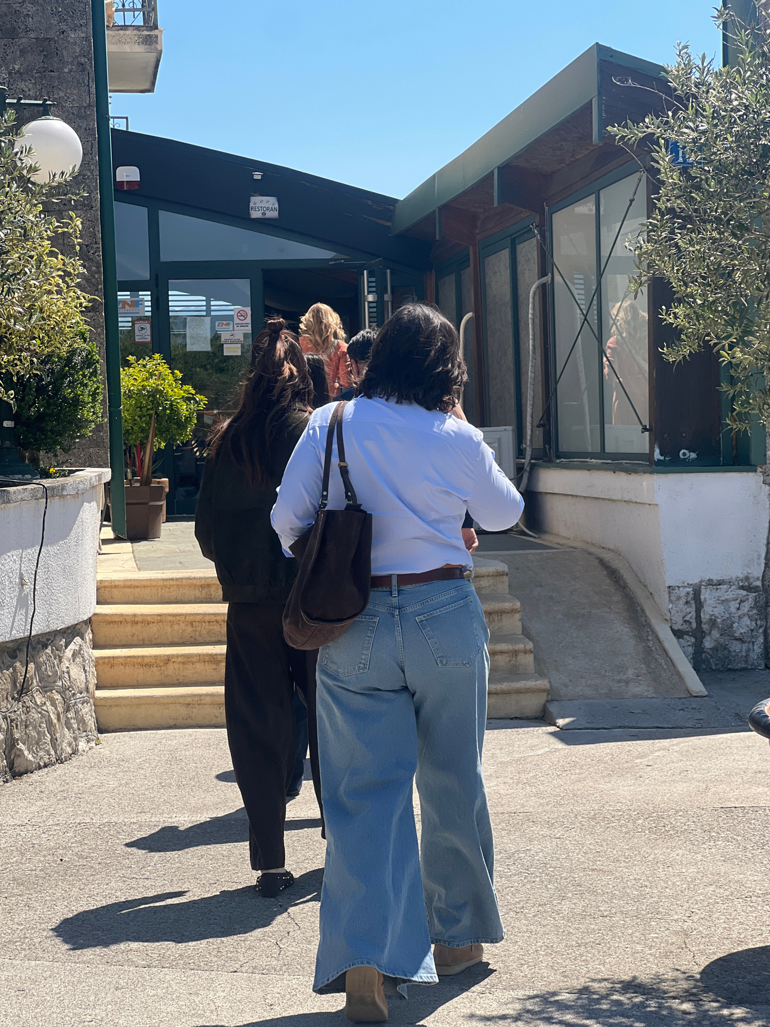 A medium shot shows two individuals standing on a sidewalk in Vranjina, Montenegro. The first person is wearing a light blue shirt, blue jeans, a brown belt, and brown shoes. They have a brown bag slu…read more