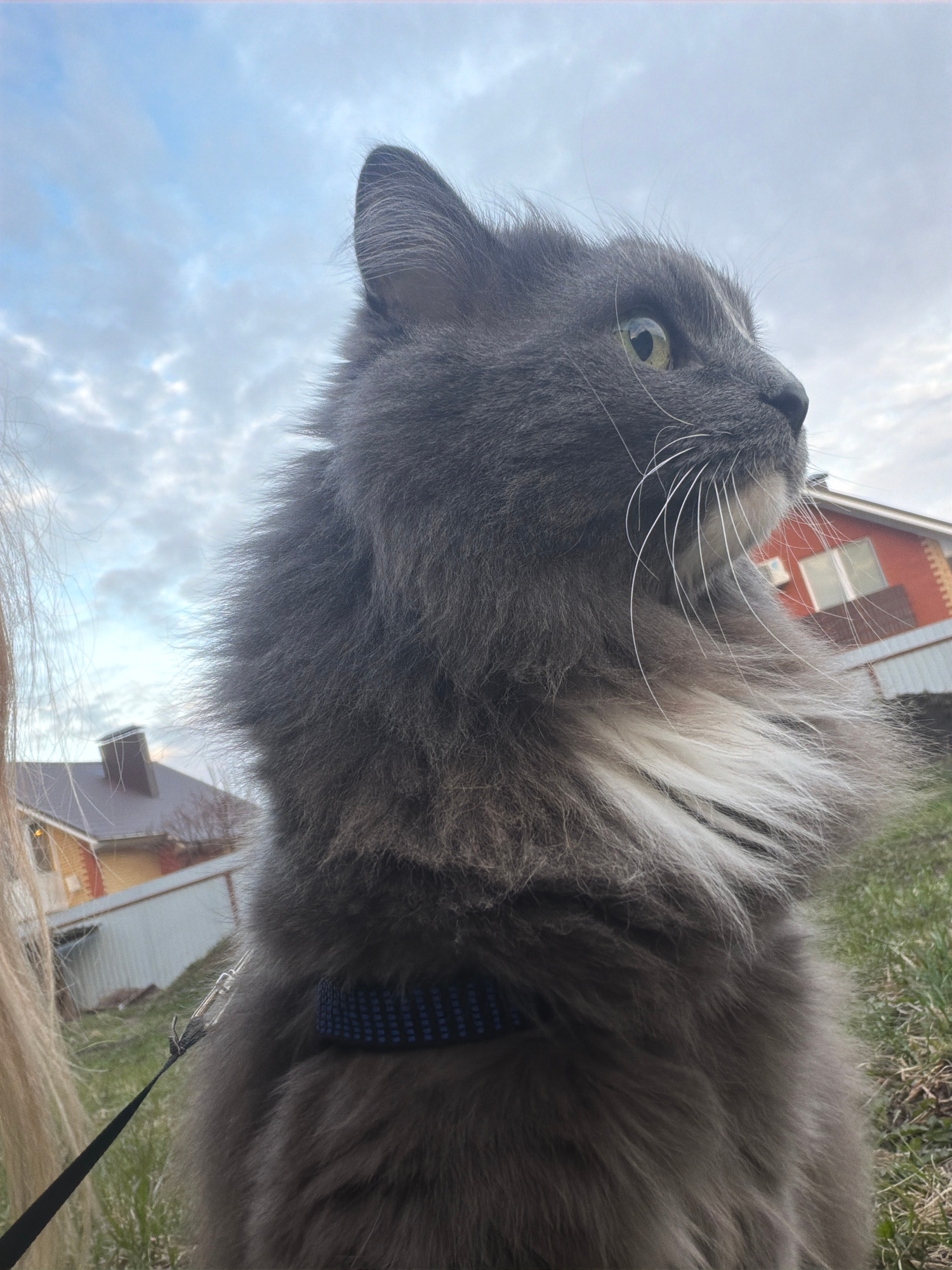 A close-up, low-angle shot depicts a gray, long-haired cat with green eyes. The cat wears a blue collar with a leash attached. The background includes a cloudy sky and glimpses of buildings, suggestiv…read more