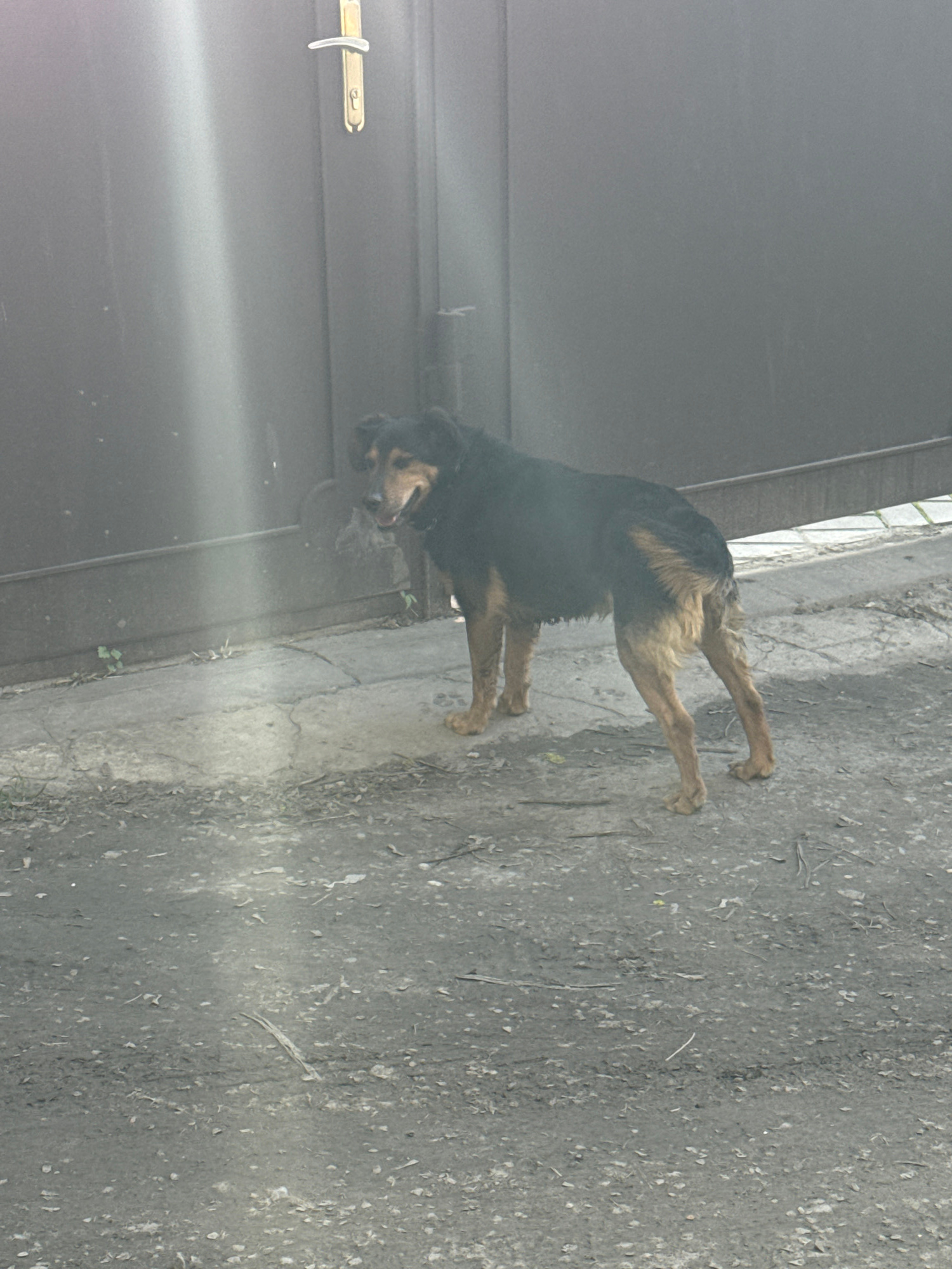 A medium-sized, black and brown dog stands on a weathered, concrete surface. The dog is positioned near a dark, metal gate with a horizontal handle. The environment appears to be an urban setting, pos…read more