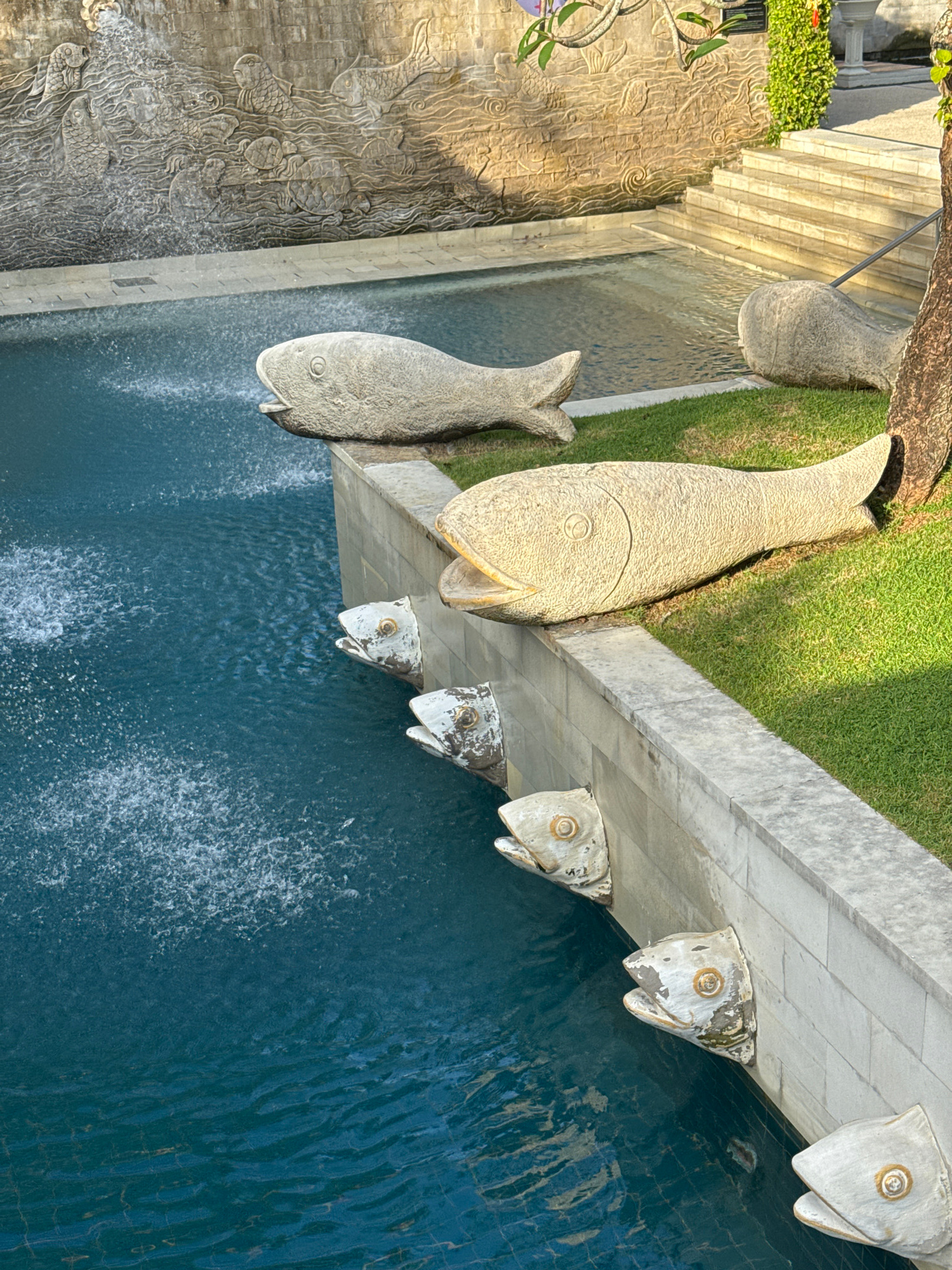 The image shows a water feature in Jimbaran, Indonesia, with stone fish sculptures. Two large, textured stone fish are positioned on a grassy area next to a stone ledge. Several smaller, painted fish…read more