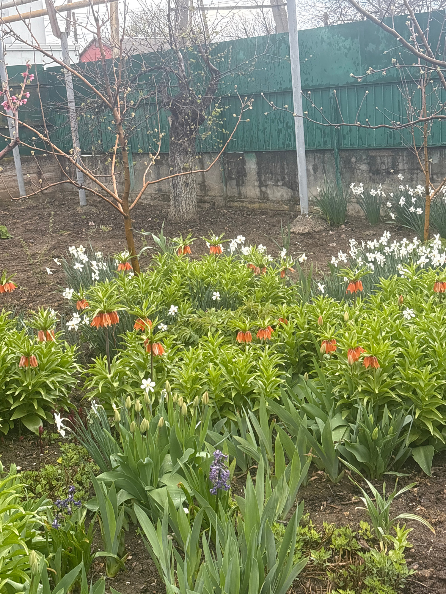 The image depicts a garden setting in what appears to be the early spring season, potentially located in Пожарское сельское поселение, Ukraine. A tree with bare branches, some showing the very beginni…read more