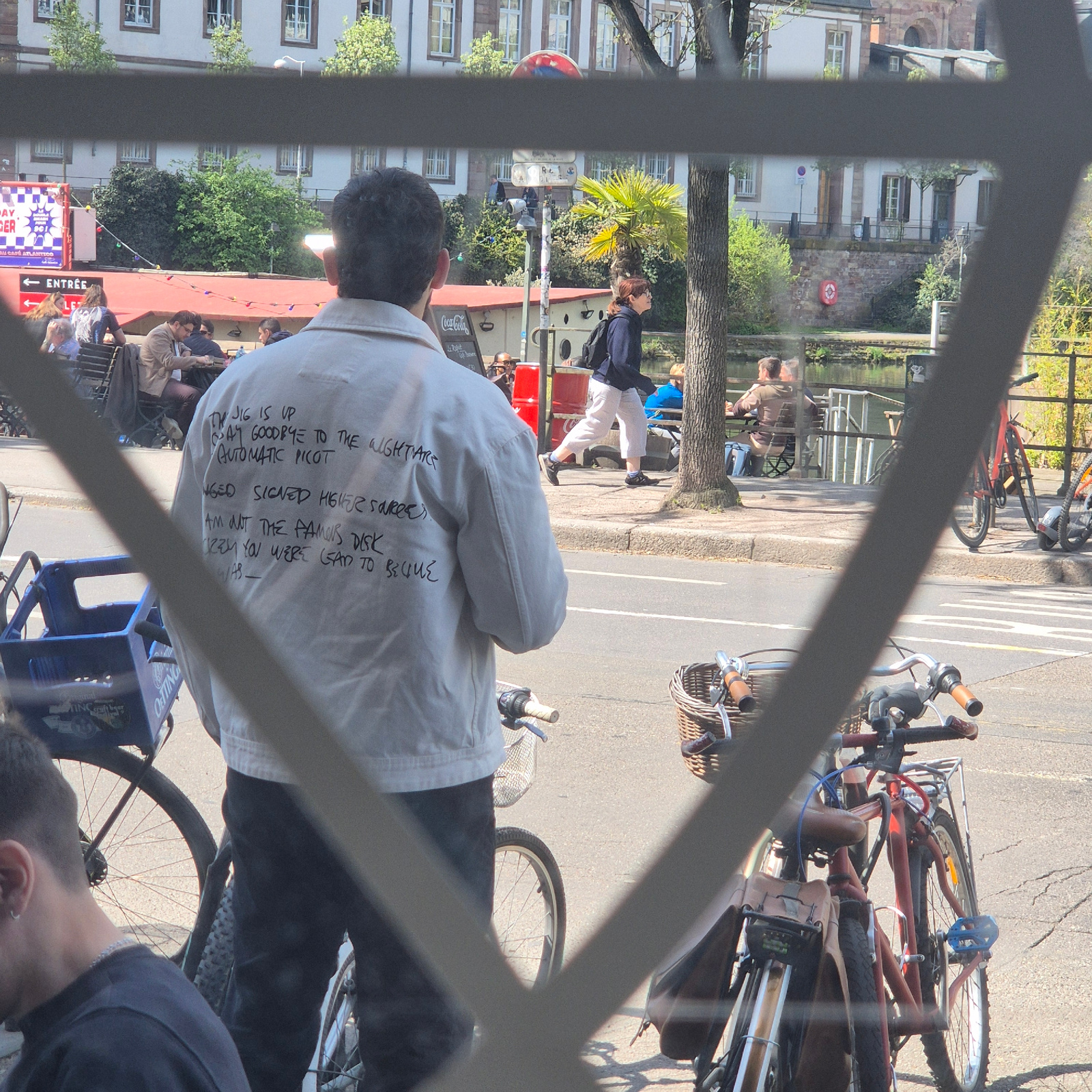 Here is a detailed description of the image: The image captures a scene in Strasbourg, France, viewed through a patterned metal fence. In the foreground, a man stands with his back to the camera, wea…read more