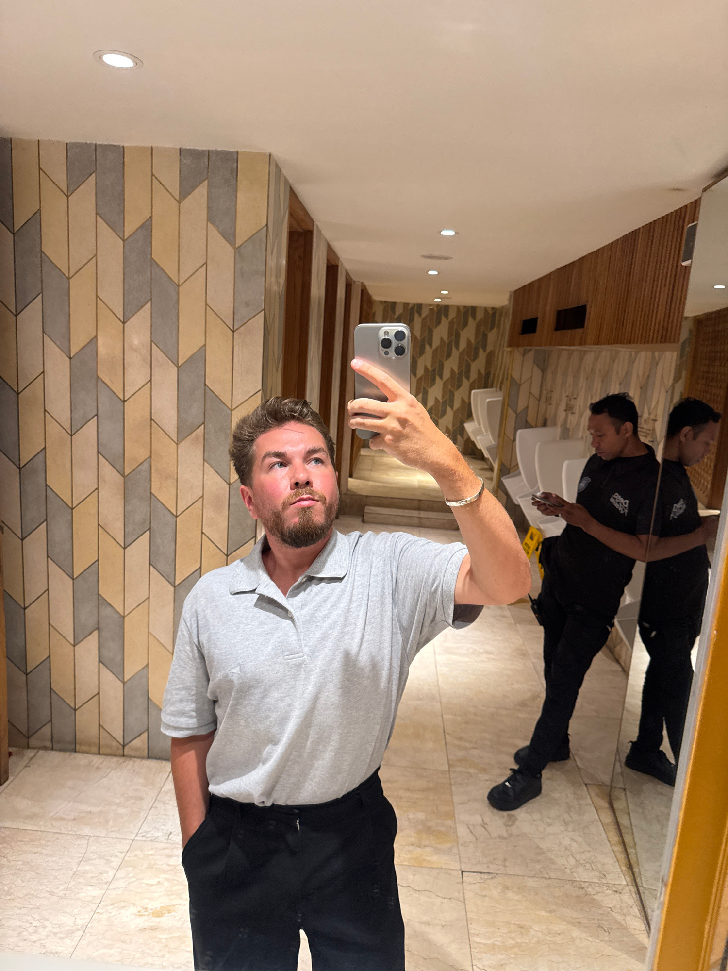 A fair-skinned man is taking a selfie in front of a mirror in a bathroom. The man is wearing a light gray polo shirt and black pants. He is holding a silver smartphone in his right hand. In the reflecβ¦read more