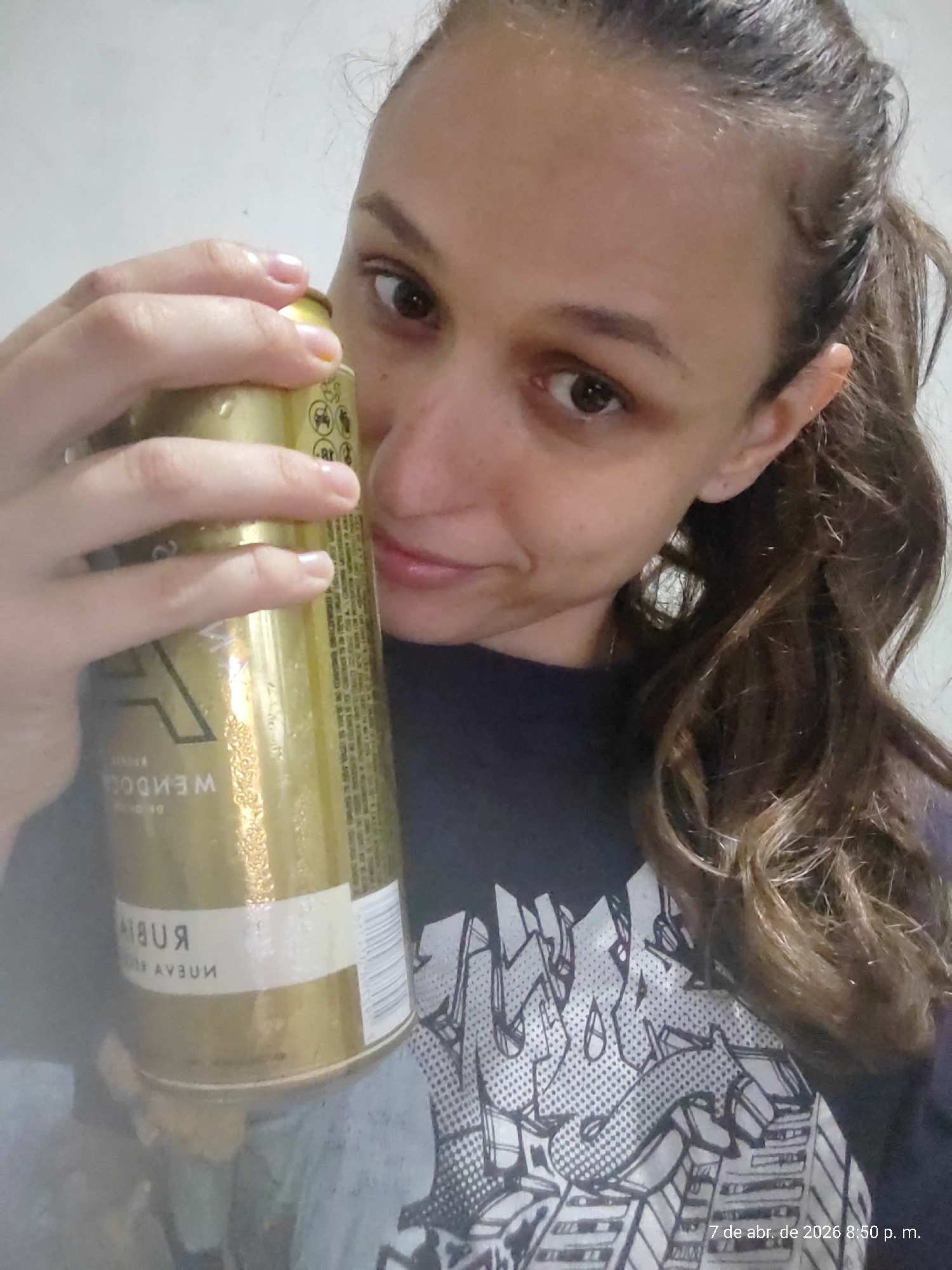 A woman with brown hair and eyes is holding a gold-colored can of beer up to her lips. The can is labeled "WEIMDOG". The woman is wearing a black shirt with a white graphic design. The background is b…read more