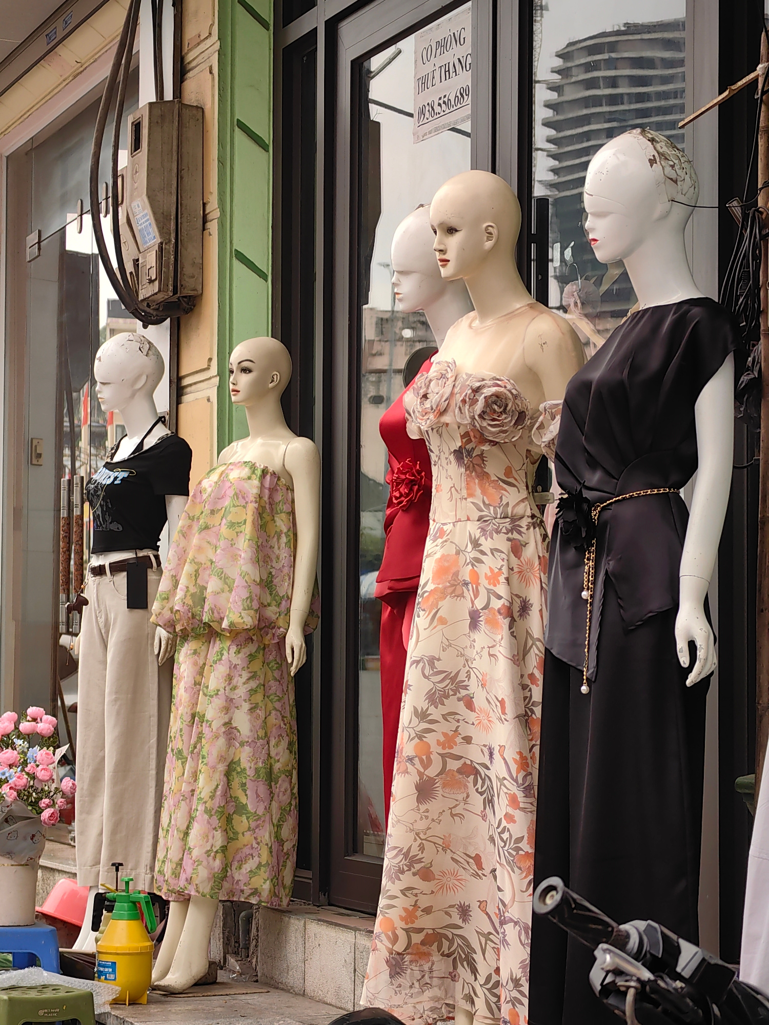 The image depicts a storefront in Bai Chay Ward, Vietnam, featuring five mannequins displayed outside. They are positioned in front of a building with green accents and a glass facade. The mannequins…read more